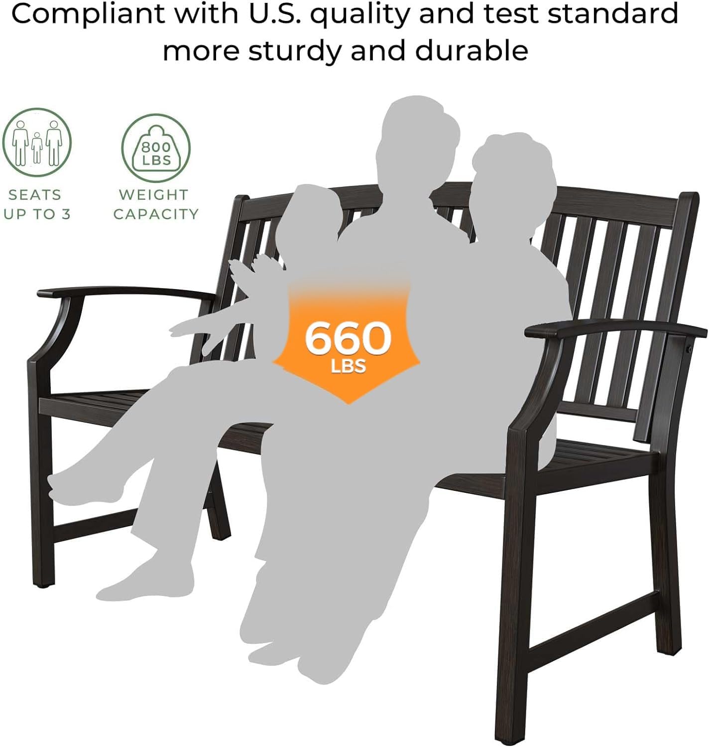 - ăSTURDY STRUCTUREăThis metal frame of outside bench provide thickened iron pipes and aluminum back and seat that have better strength, can hold up to 660 Pounds