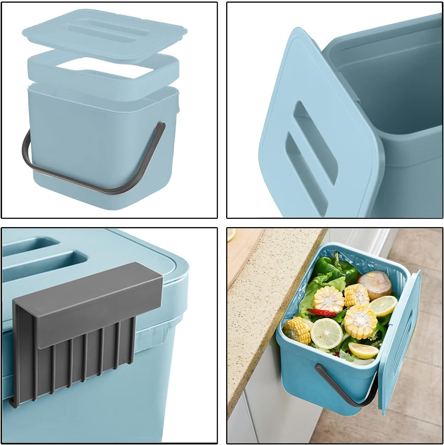 - Wall Mount/Under Sink/Countertop Trash Can: The small trash can with lid can be easily hung on kitchen cabinet doors, pantry doors. (The thickness of the door should be less than 0.86 inch) Moreover, this food waste caddy can also be wall-mounted to under sinks, cupboard, kitchen wall or bathroom wall with adhesive pad or screws.