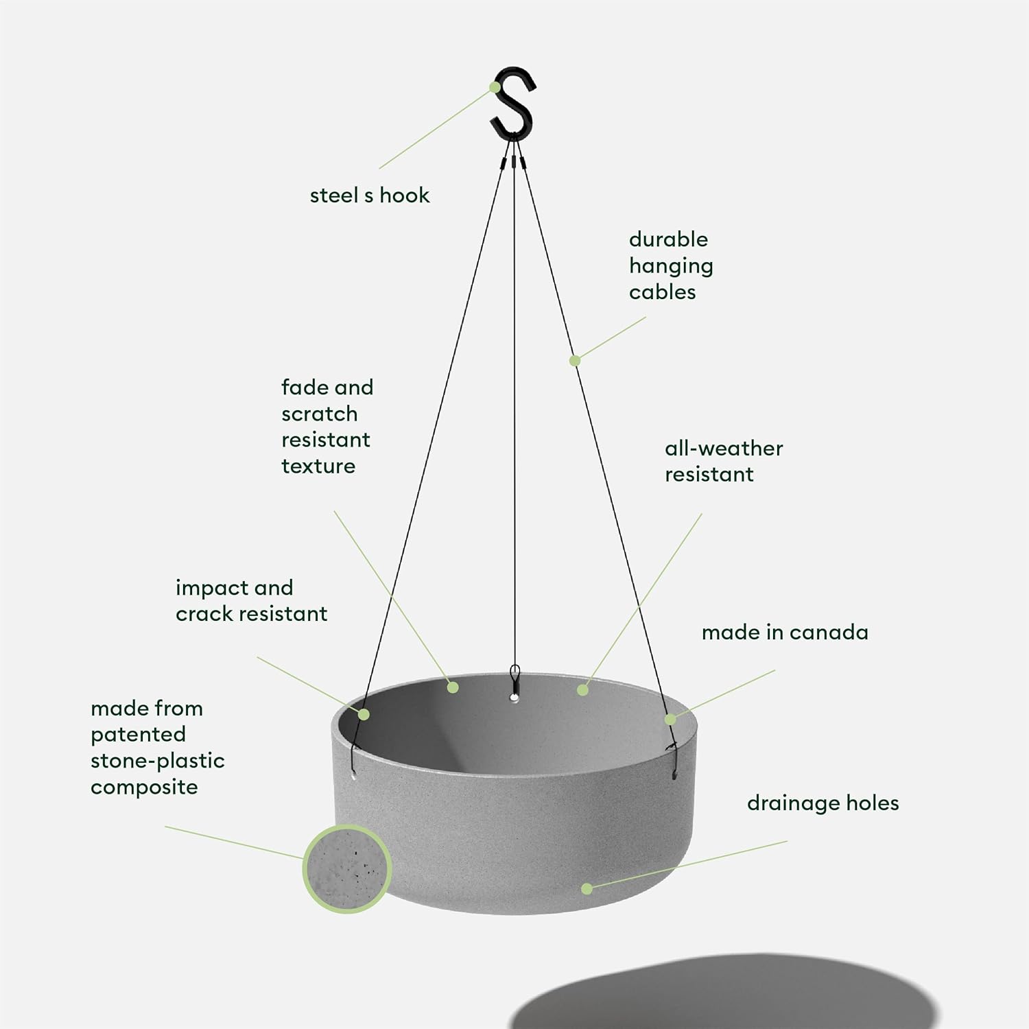 - DURABLE MATERIAL: Made from a plastic-stone composite, the Hanging Kona Bowl planter has a subtle textured finish and is all-weather resistant to cracks, scratches, UV and fading; perfect for hot or cold climates ranging from -20 to +120 degrees