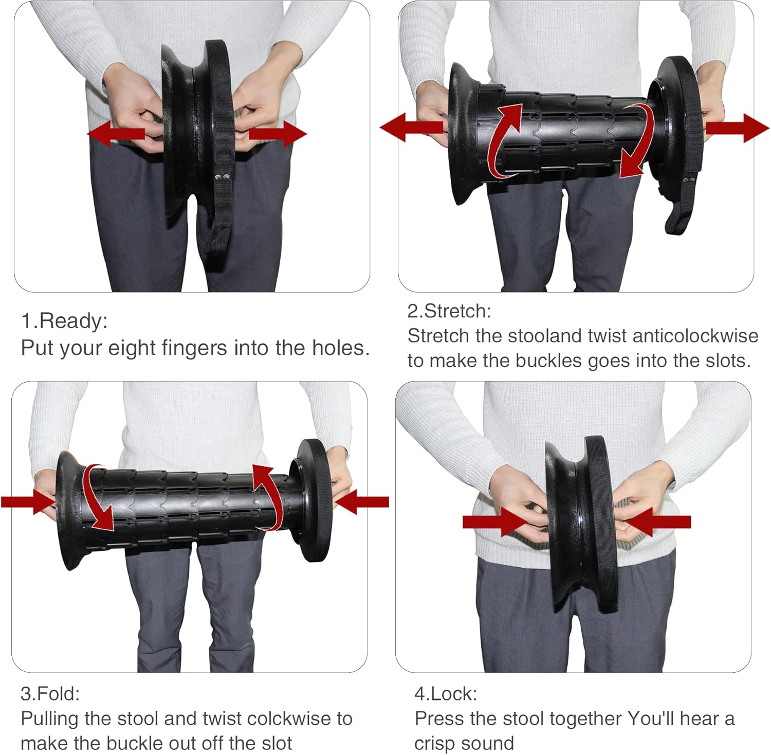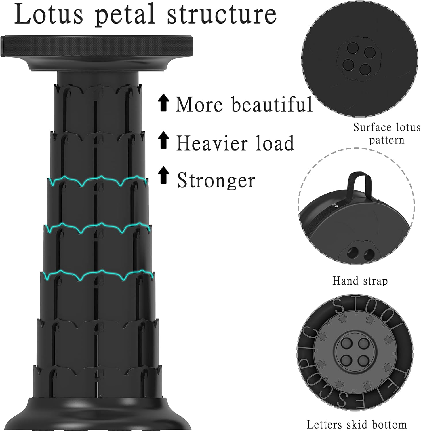 - ăSafety and High Stabilityă Made of high-strength heavy duty environmental friendly material plastic PP, the cylinder shape structure, tight connecting clasps, and the non-slip base ensure the stability of collapsible stool. That provides safe and comfortable seat. The maximum load capacity is as much as 550 lbs(250kg)!