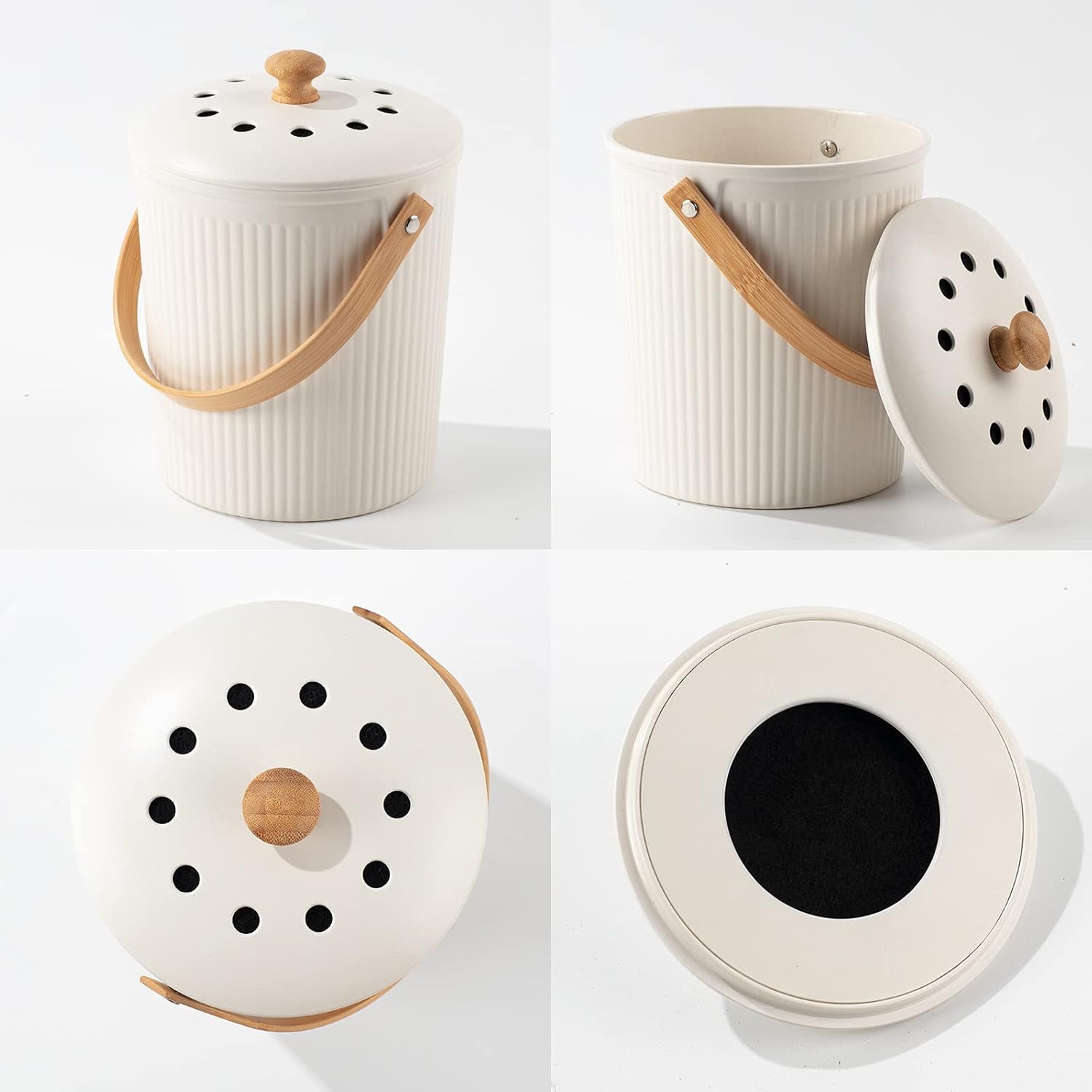 - Odorless: The counter compost bin has a vented lid and charcoal filter that absorbs and traps odors inside of the compost bucket. No worry about your kitchen smelly decomposing waste again.