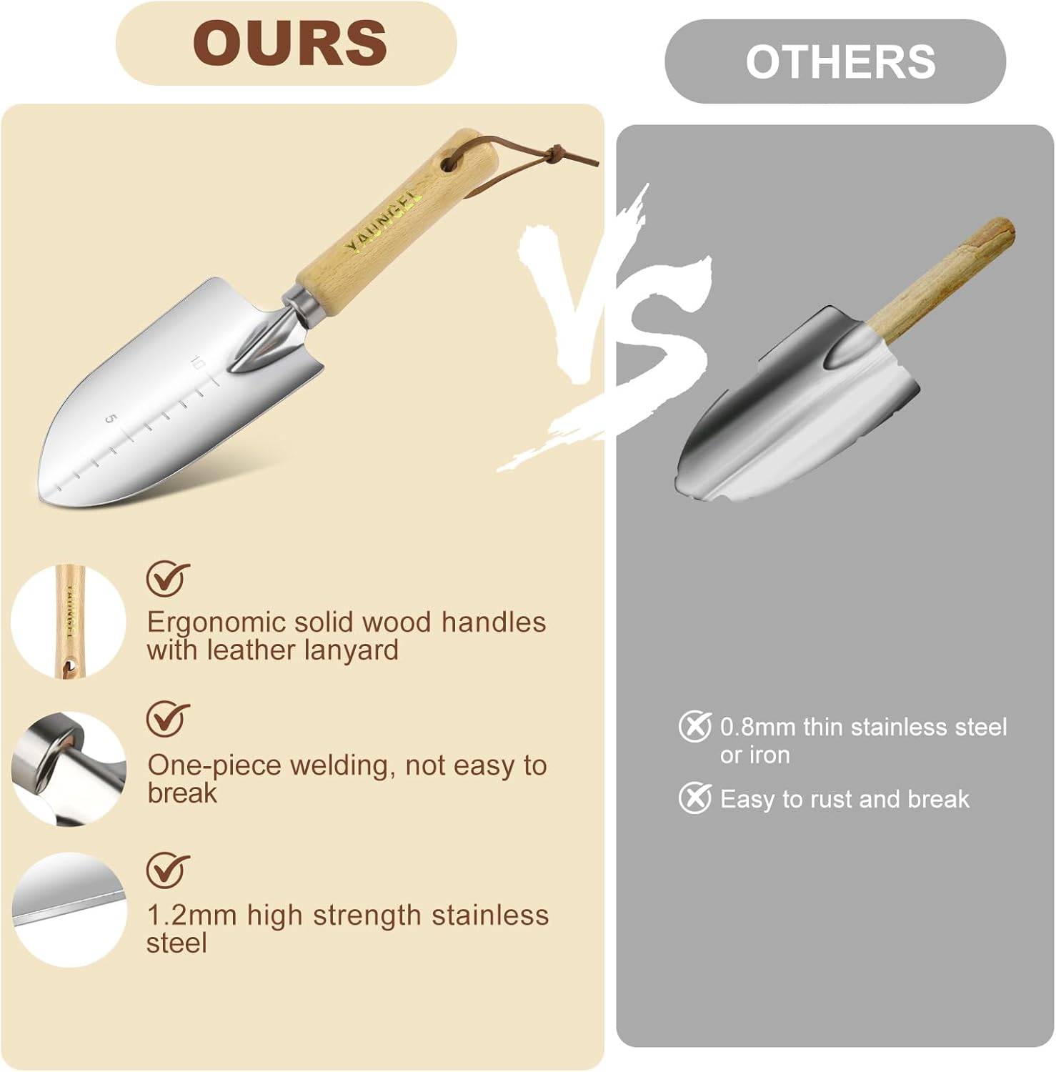 - Durable Stainless Steel Garden Tools - Heavy-duty stainless steel heads can withstand the toughest roots, rocks, and soil, sturdier than cast aluminum/coated/carbon steel, No need to worry about rusting and breaking during pruning, digging, weeding, etc. Mirror-polished process to make the tool get the minimal soil adhesion and easier cleaning.