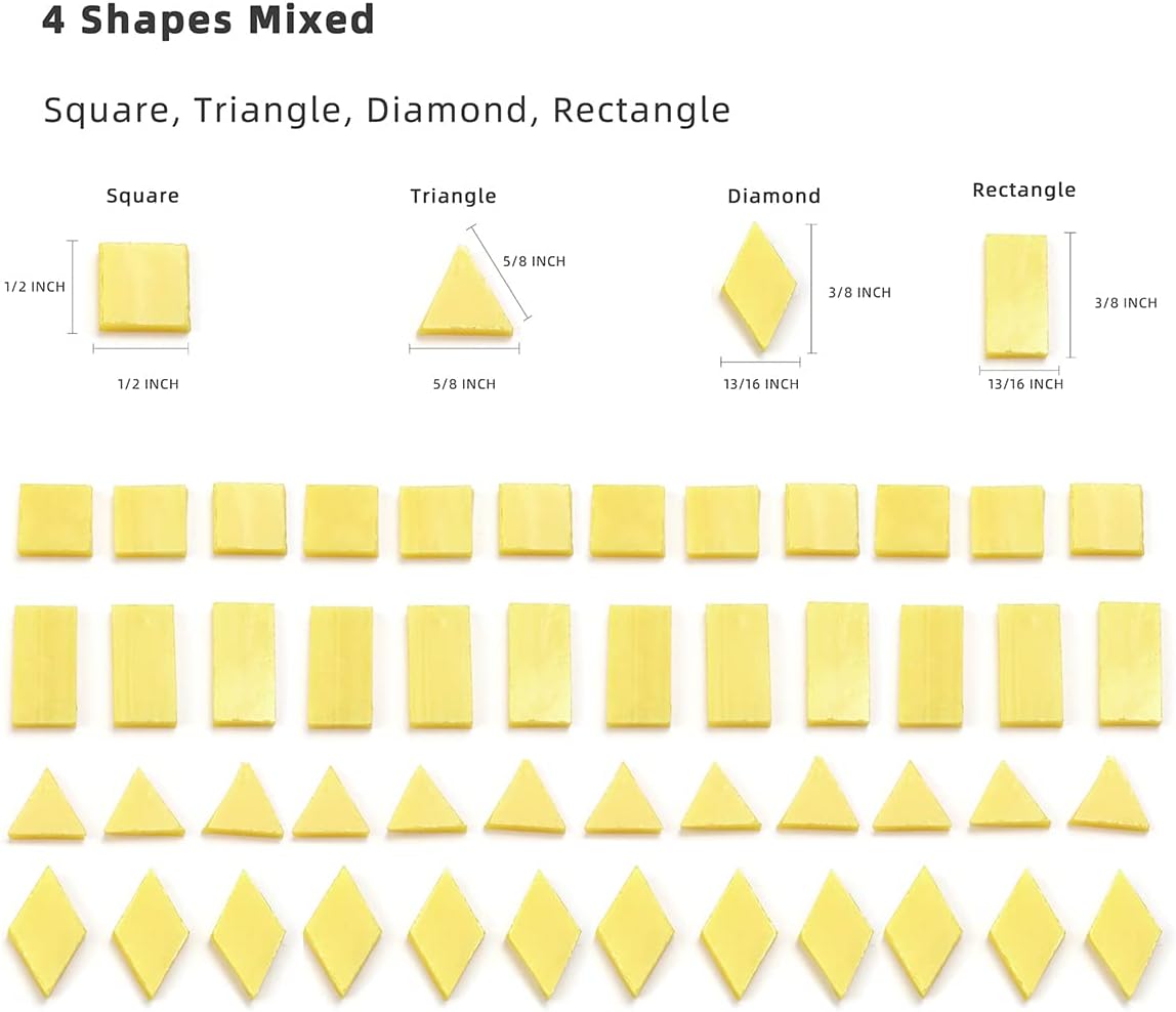 - 4 shapes mixed in each package - These mosaic pieces come with Square, Rectangle, Diamond and Triangle. Having all these precut beautiful shapes will not only save you a tremendous amount of time, but will also inspire you when trying to create new designs