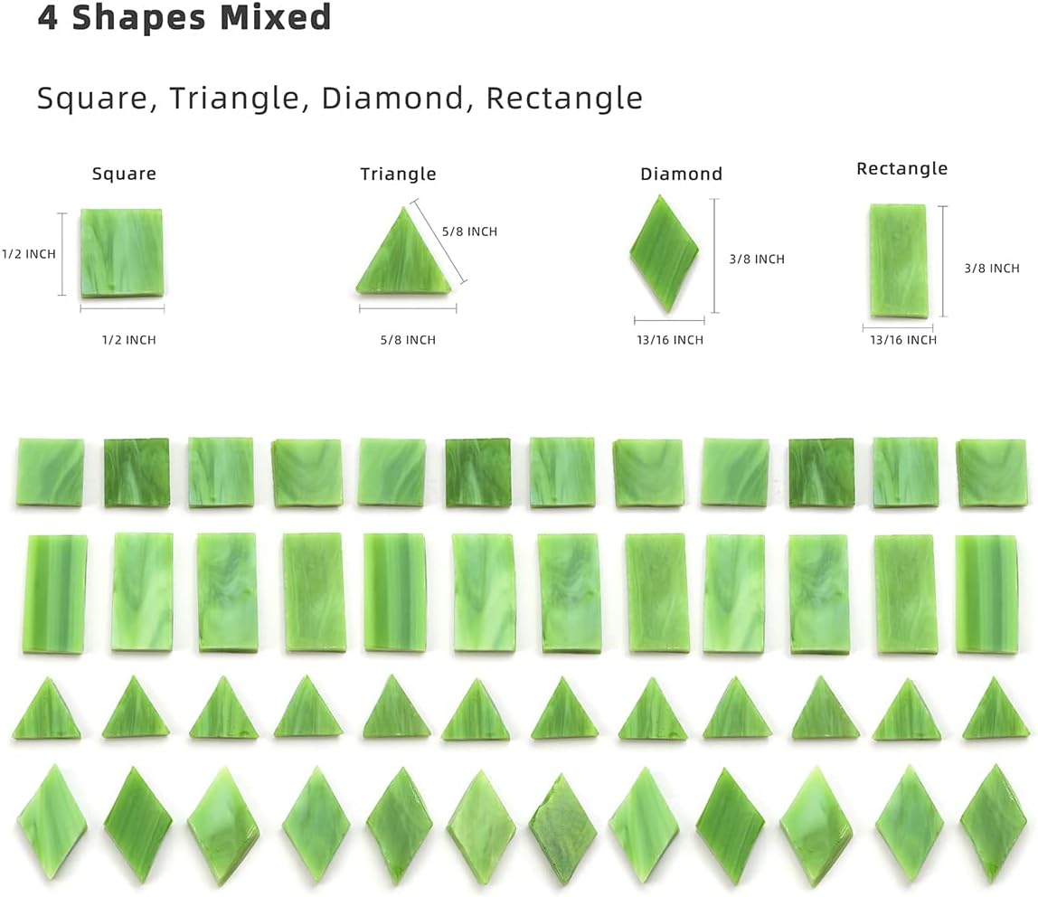 - 4 shapes mixed in each package - These mosaic pieces come with Square, Rectangle, Diamond and Triangle. Having all these precut beautiful shapes will not only save you a tremendous amount of time, but will also inspire you when trying to create new designs