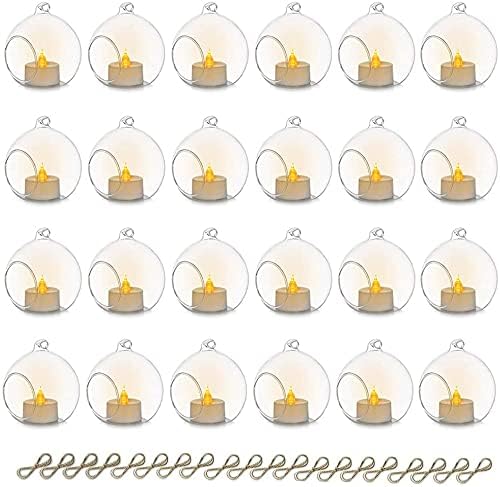 Sziqiqi Hanging Glass Tealight Candle Holder with LED Candles - 3.15inch Tea Light Globe Terrarium Holders Ornament for Wedding Christmas Birthday Halloween Party Centerpieces Decor 24pcs
