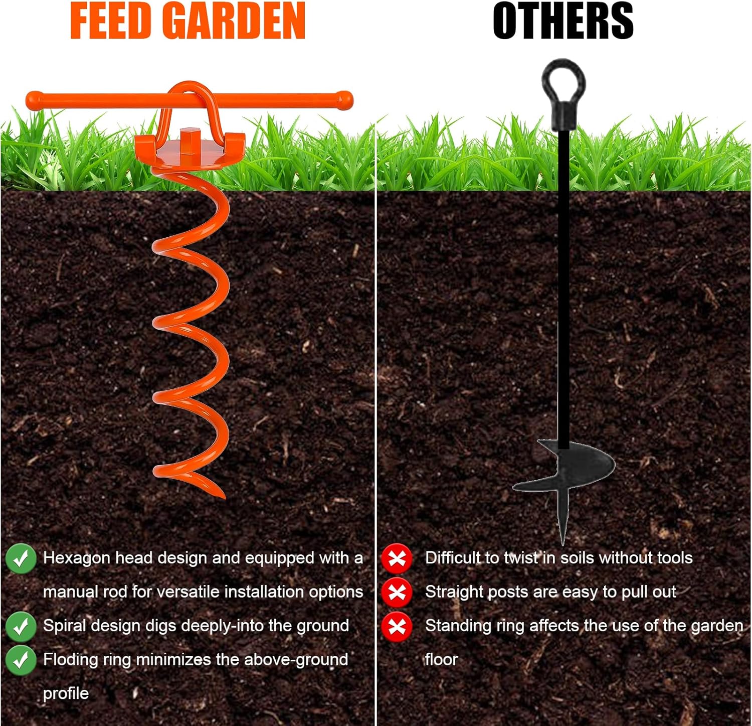 - Thick & Stable: FEED GARDEN spiral stakes is made of powder-coated solid steel, which is not easy to rust. The diameter of our ground stake is 9 mm, which is thicker compared to the 8mm thickness of most of the market, so they’re more durable for various ground conditions that others cannot achieve. Spiral design allows it to dig deeper into the ground and withstand extreme pulling forces to keep your outdoor equipment from tipping over or moving, even in high winds and poor weather.
