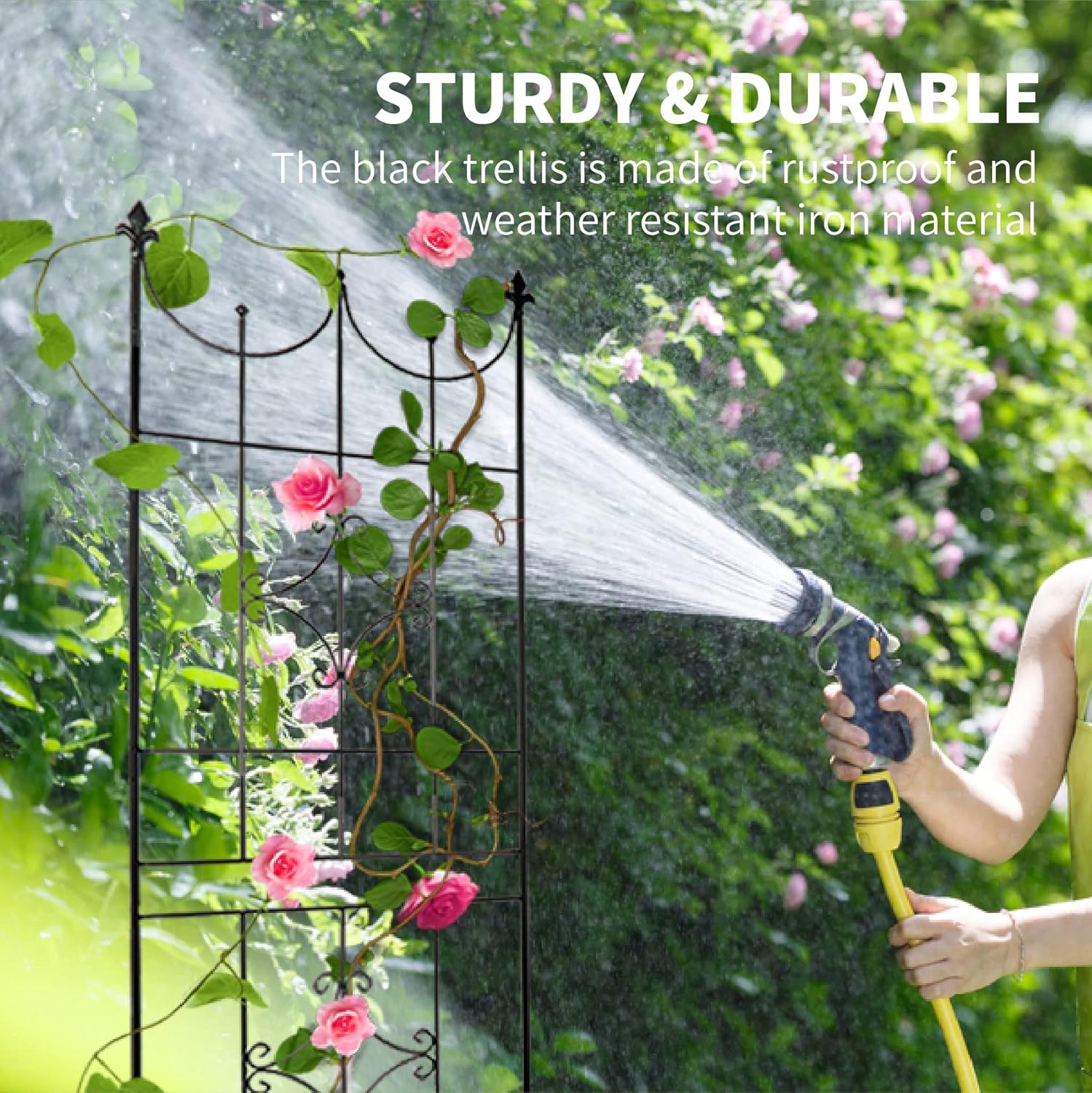 - [Sturdy Stability Structure]: With heavy duty iron frame and powder coated welded material. 11.8 inch ground spike inserts into the ground and add stability to the trellises.