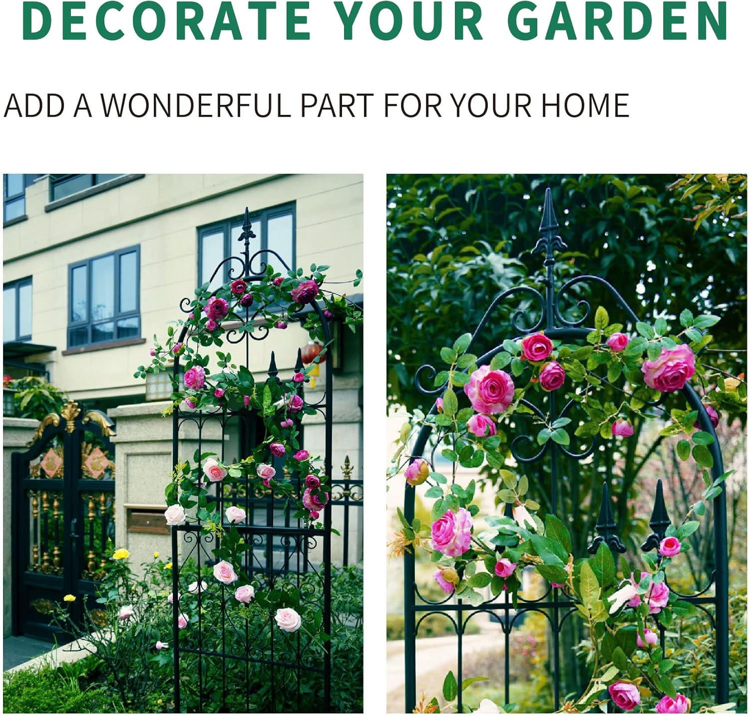 - [Stable Structural]: The metal frame of the lattice has strong and sturdy foundation of welded Iron that allows this 7.2ft structure to stand with stability.Wide arch side panels increase the climbing area of plants.