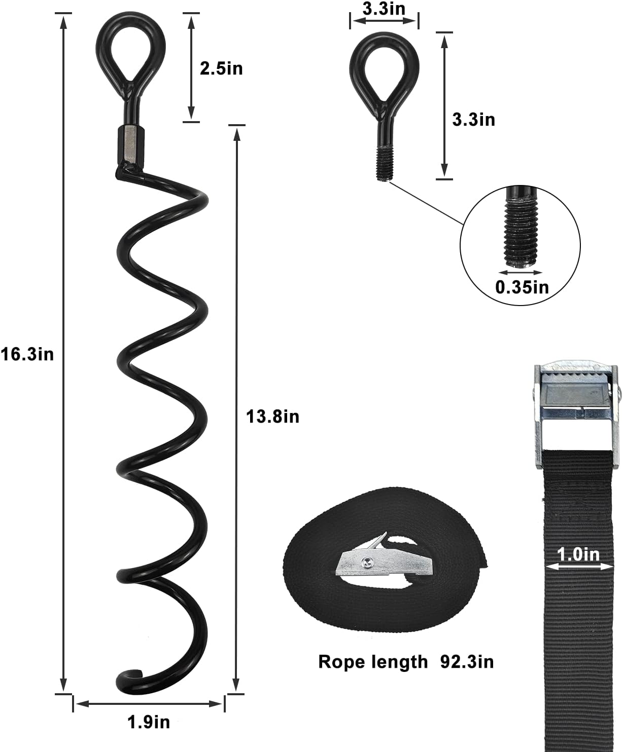 - DURABLE & STRONG GROUND ANCHORS: Spiral ground anchors are composed of sturdy steel, and the most recent spiral top angle design may lessen the strain to better assure stability and longevity, so it won't readily break even when used in inclement weather. The ground anchor stakes' service lives can be increased by using dog tie-out stakes with black powder coating to effectively prevent rust and cracking
