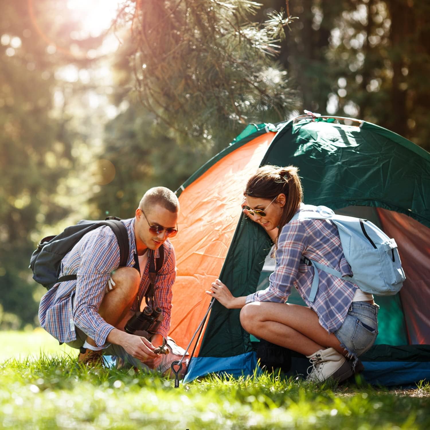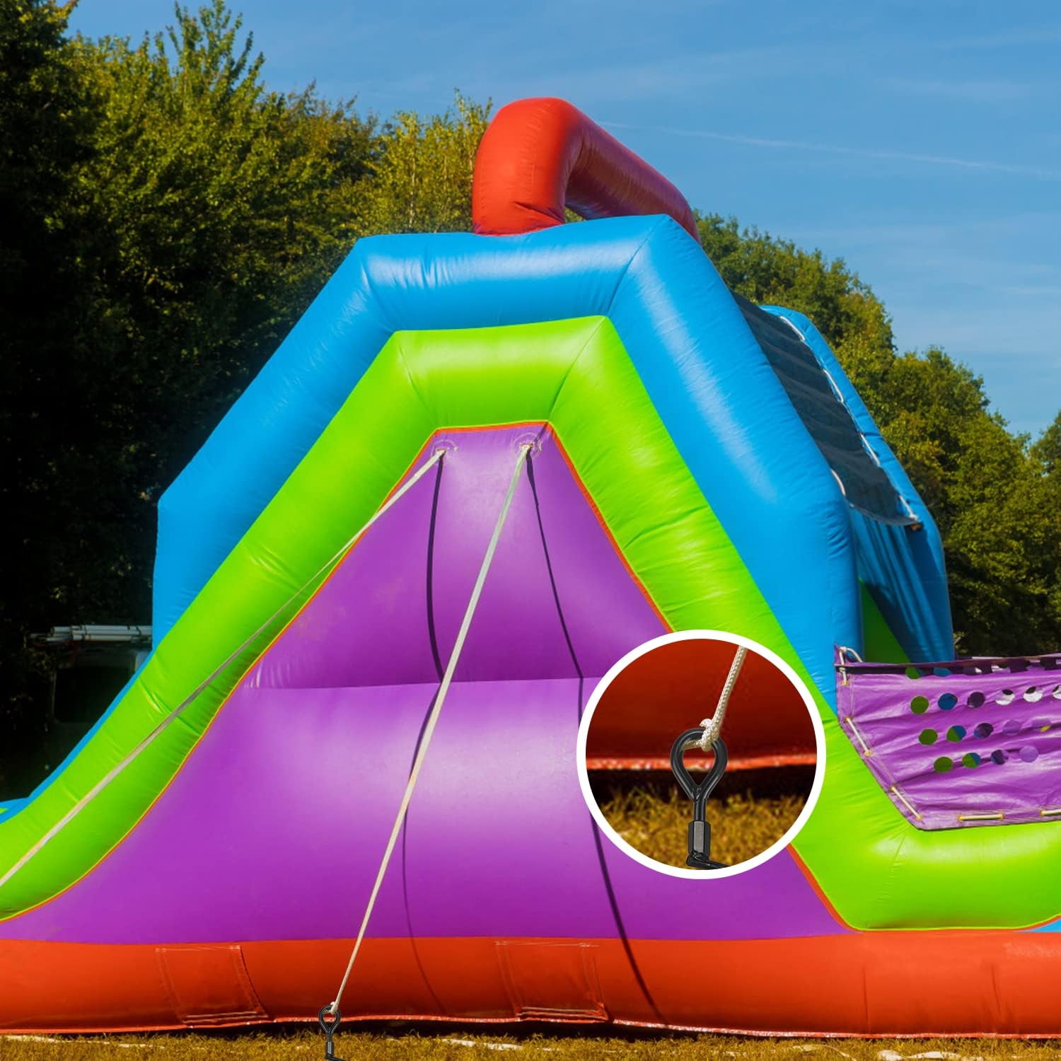 - WIDE APPLICATIONS OF SWING SET ANCHORS: The anchors for swing sets have several applications. It aids in properly anchoring the trampoline tent to the ground in windy conditions. Moreover, children's swing sets, dog houses, fences, canopies, sheds, carports, trees, etc. all work nicely with heavy-duty tent stakes