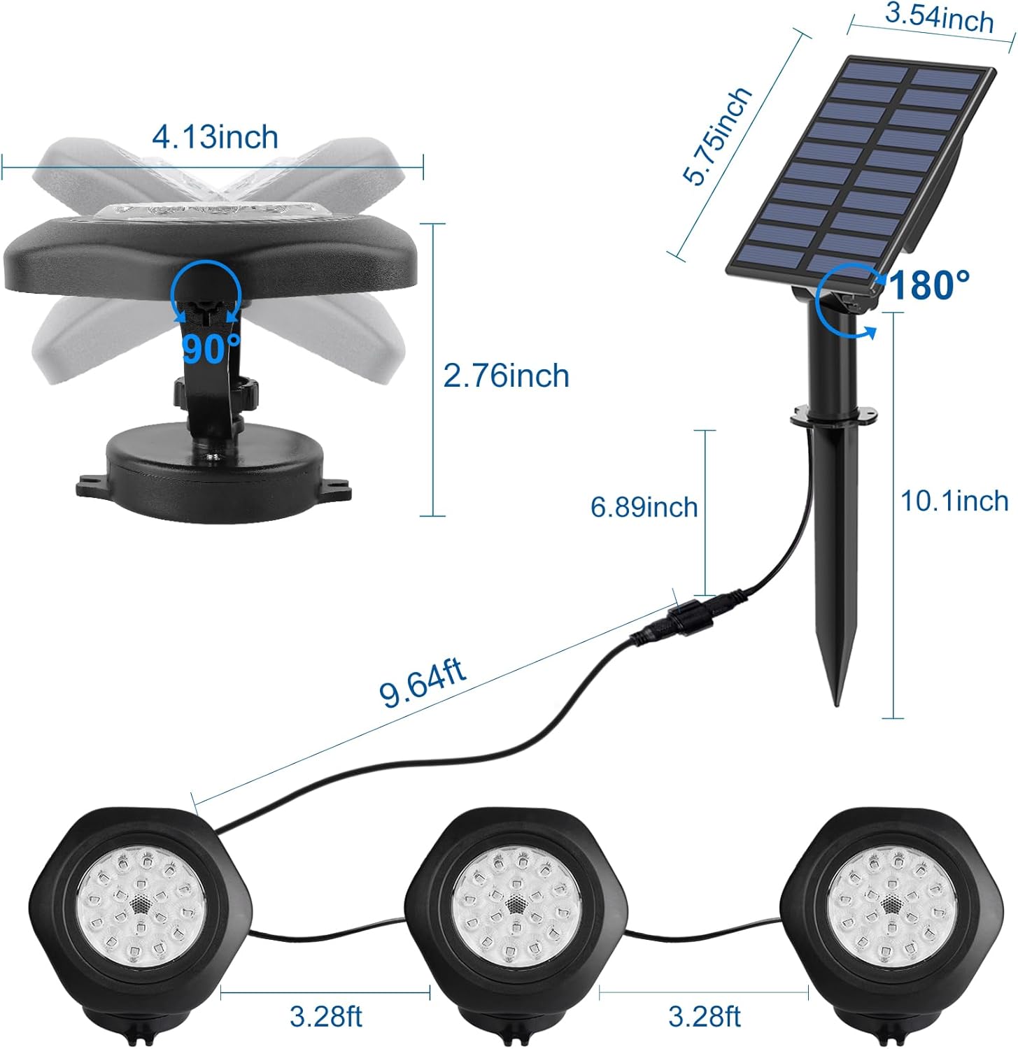 - 3-in-1 Solar Pond Lights: Adjustable, Brighter & Longer Wire. The light heads can be adjusted 90 degrees. One light have 18 LED beads, total 54 LED, Super bright, comes with 17ft/5m wire, more flexible and convenient to use.