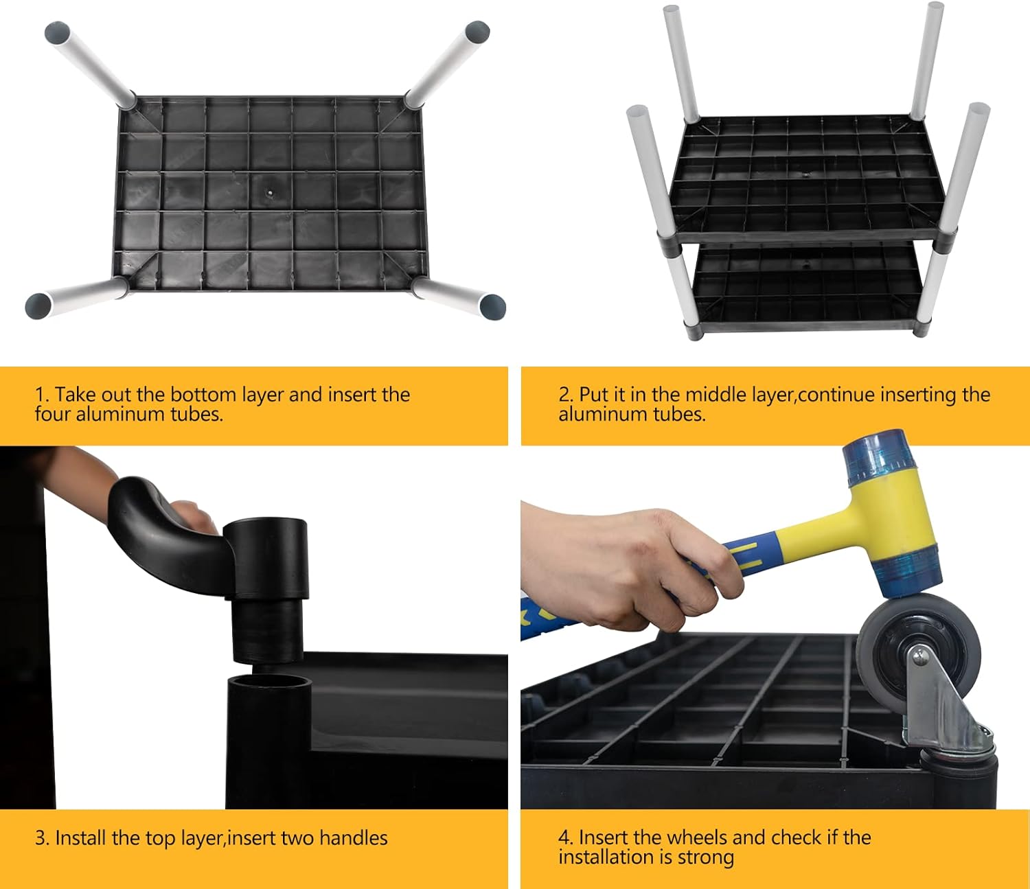 - 🌞 Dear customer, it is difficult to disassemble the utility cart after installation, so please make sure that the 1" plastic side on each tray‘s back is placed in the same direction before installation. Please contact us if you have any questions, and we will answer you ASAP.