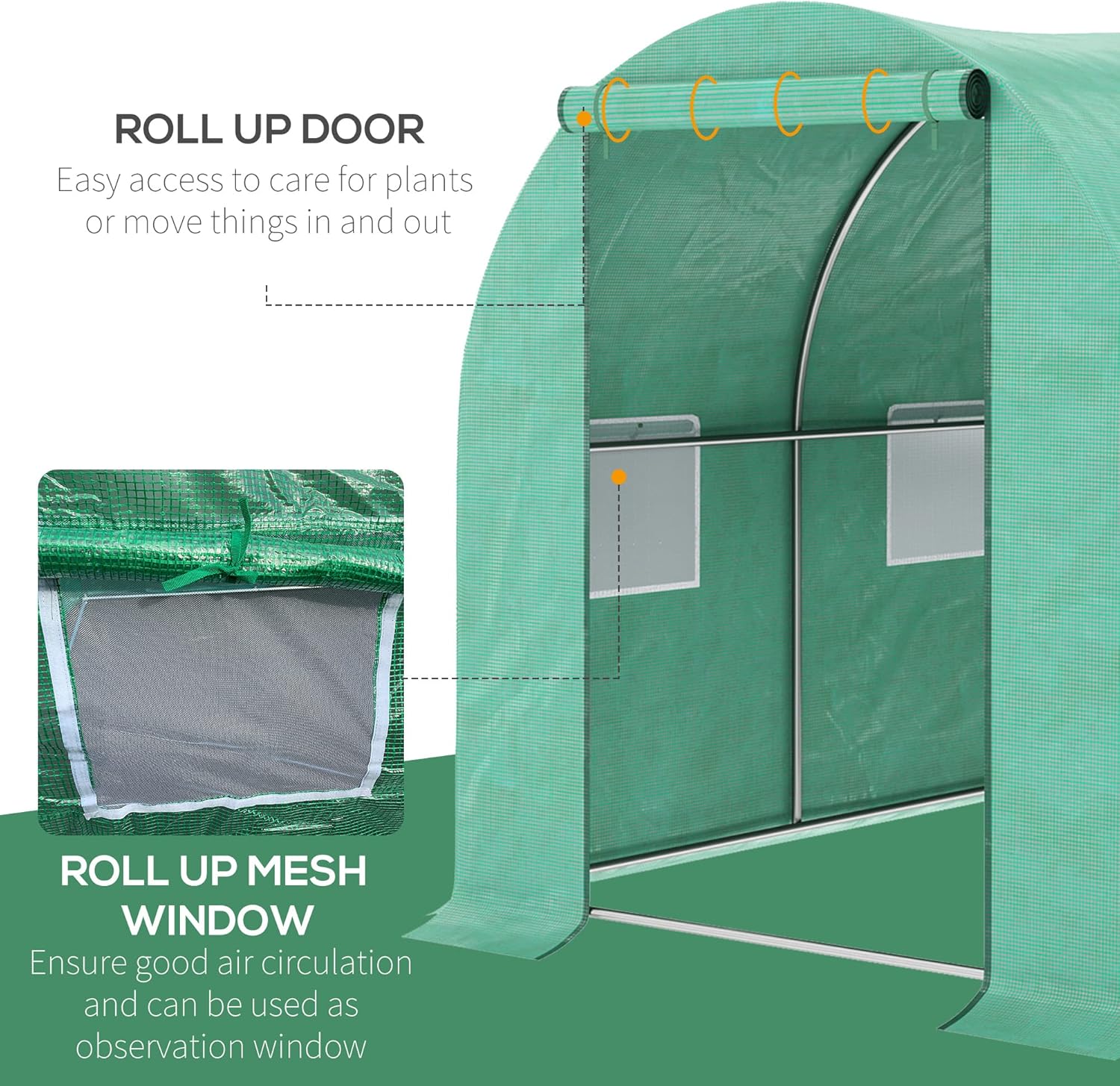- Large Zipper Door & Roll-Up Windows: Featuring a large zipper door, you can easily access your backyard greenhouse tent by walking in and sealing it shut when you're done. Provide fresh air and get rid of excess humidity; it's a very versatile venting solution. Make use of the eight roll-up mesh windows to vent the area more slowly and provide fresh air for your plants.