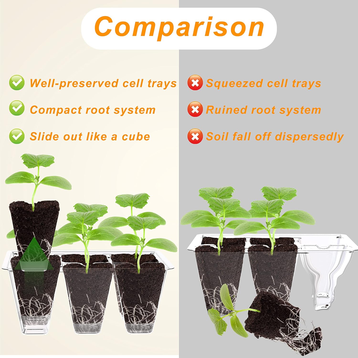 - Detachable Base - The base is designed to be detachable and on the inside of the seed starter tray, works amazingly to eject roots smoothly out. It's the only way to safely, basically risk free, to get the plant out of its seedling home. No squeezing trays makes they become truly reusable!