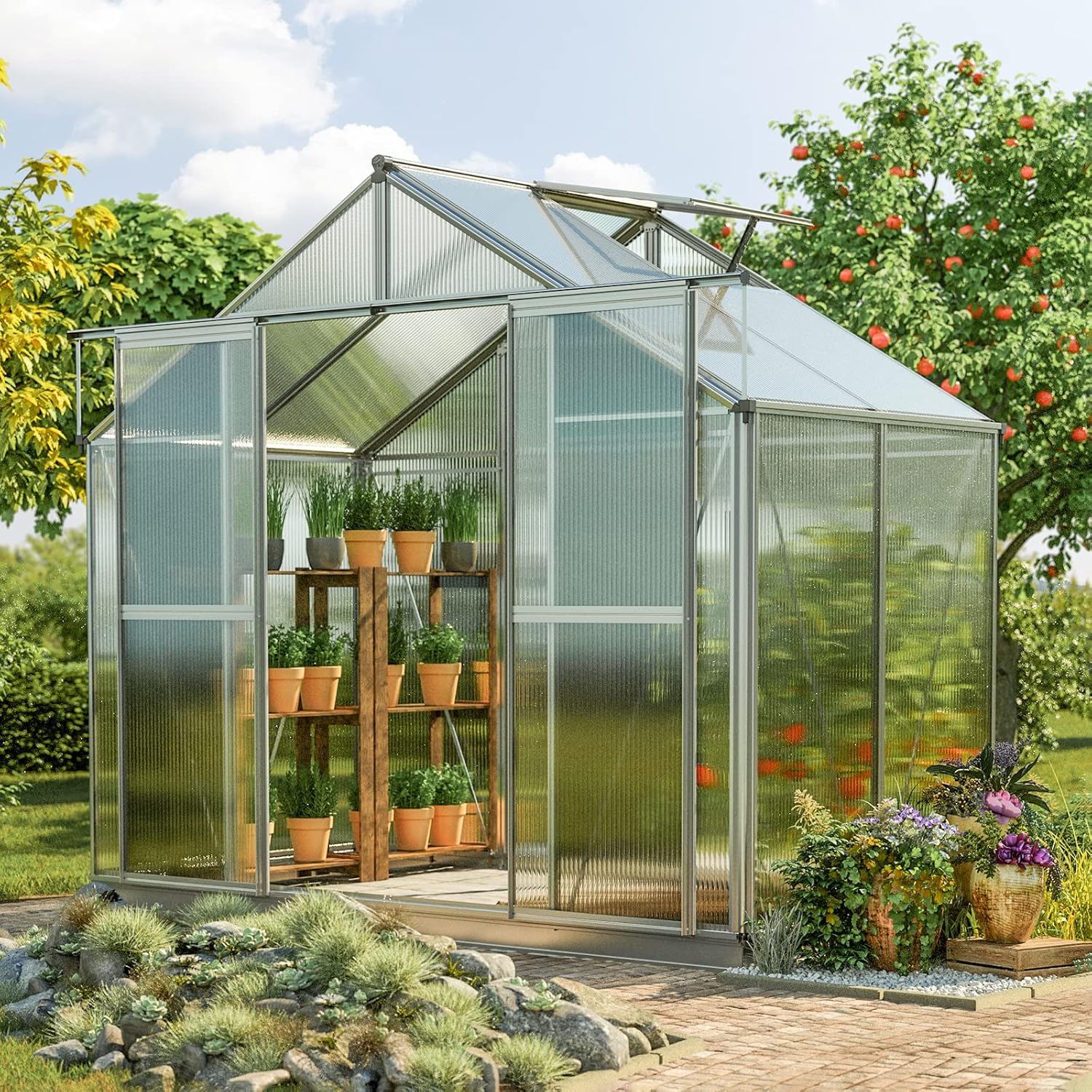 - PREMIUM GREENHOUSE: Sturdy aluminum construction with reinforced hollow chamber profiles, stainless steel screws, aluminum base frame, weather-resistant polycarbonate panels, automatic vent opener