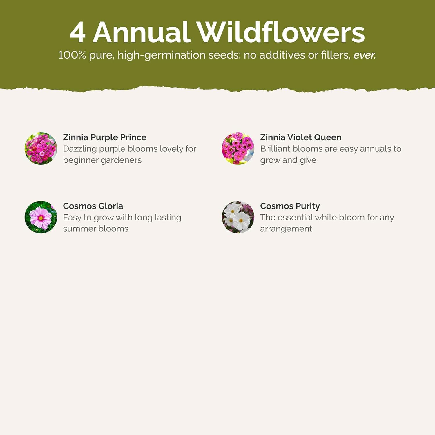 - 100% Pure, Non-GMO Seeds - No fillers, favorites only! Includes 4 easy-to-grow species: Zinnia Purple Prince, Zinnia Violet Queen, Cosmos Gloria, Cosmos Purity