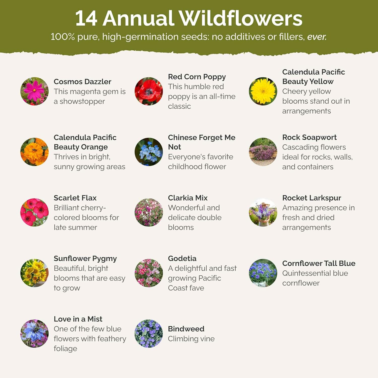 - 100% Pure, Non-GMO Seeds - No fillers, favorites only! Includes 9 easy-to-grow species: Cosmos Dazzler, Rocket Larkspur, Shirley Double Mix, Sunflower Pygmy, Calendula Orange, Cornflower Tall Blue, Calendula Yellow, Nigella Hispanica, Saponaria Pink