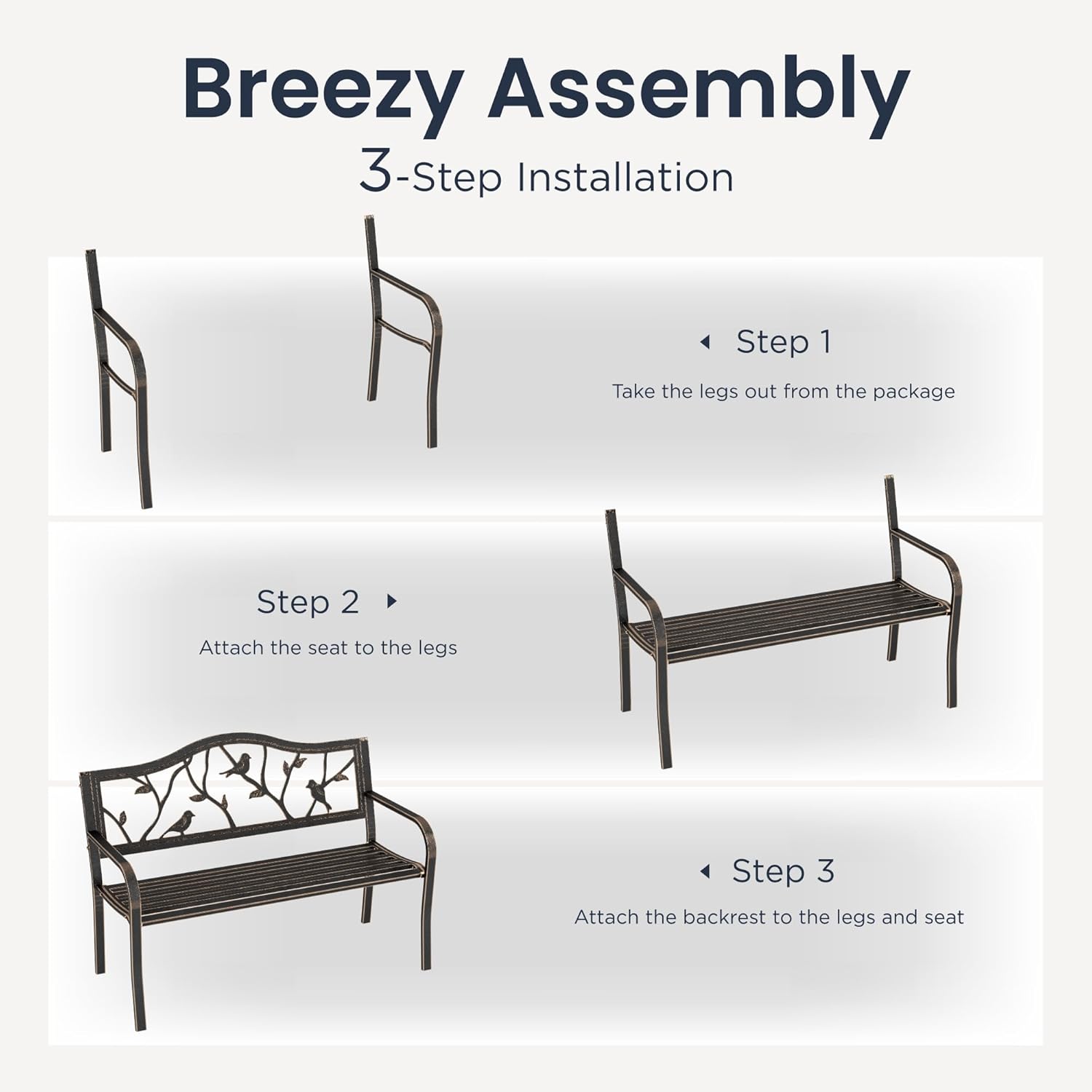 - ăEasy to Assemble the Metal Benchă Specific manual and complete accessories of the Garden Bench greatly help you spend short time to finish the assembly work. Package included the instruction and screws, nuts and washes. It is easy for one person set it up within 15 mins