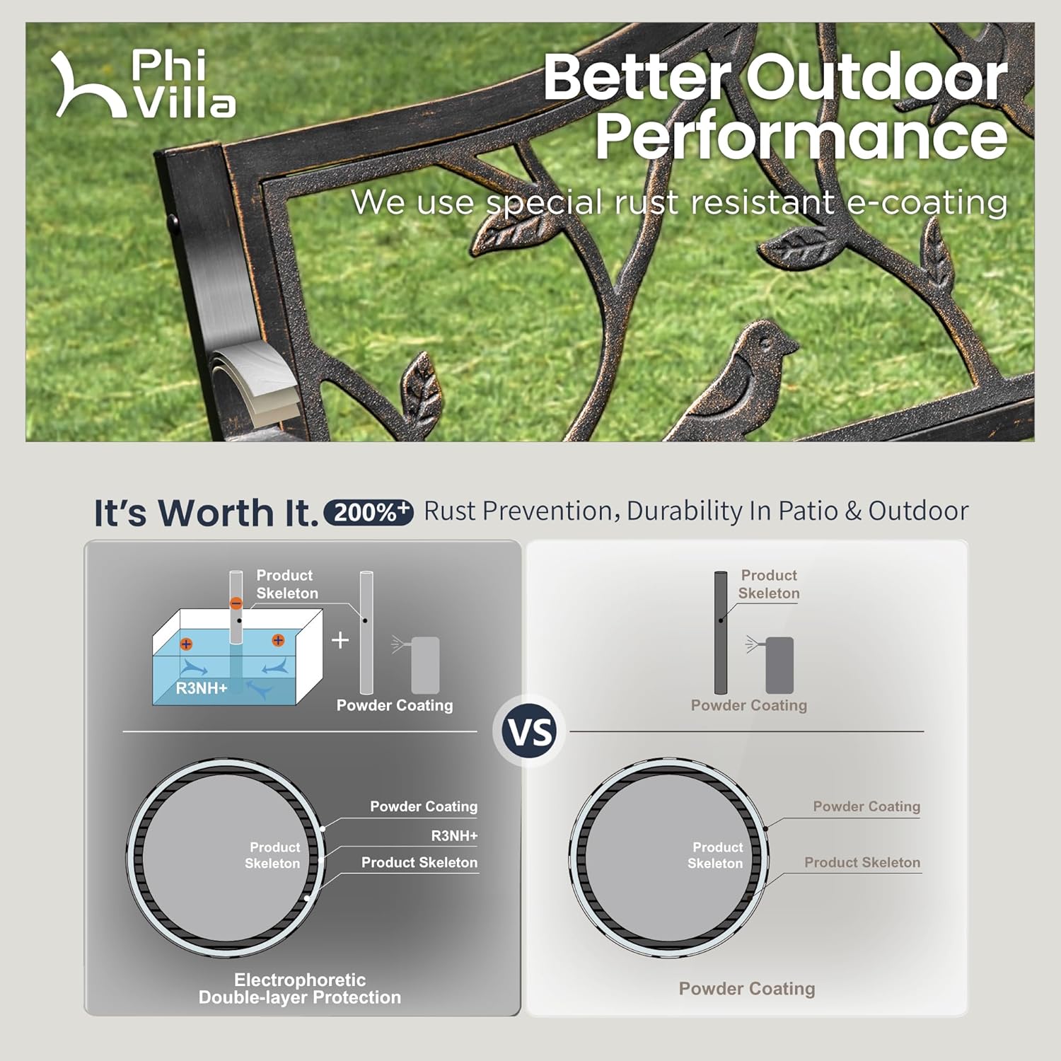 - ăSturdy and Rust-ResistantăThe Garden Bench is powder coated with rust-resistant finish, super smooth. This garden bench is made of cast iron backrest and metal frame,which is stable and sturdy for long-term use, durable and the Metal Bench perfect for use for years.
