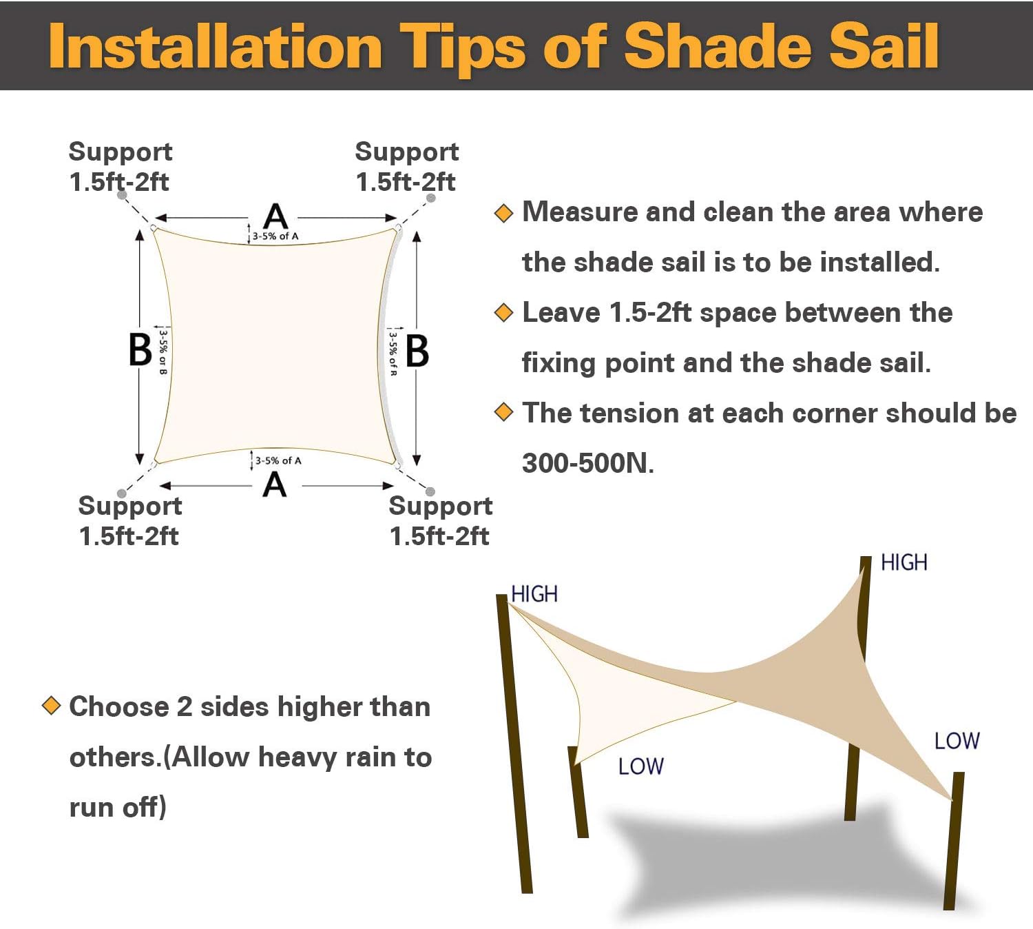 - High Quality Materials: Made of 100% brand new 185 GSM HDPE (high density polyethylene) material.Our sunshade sail is attached with DOUBLE layer webbing in each side and stainless steel D rings in corners to make the sun sail shades stronger and more durable