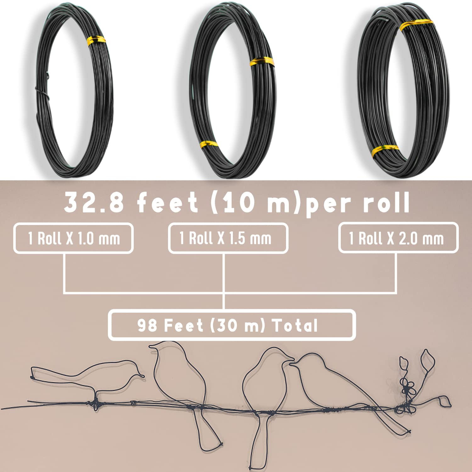 - PACKAGE INCLUDE: 1 x wire cutter, 1 roll x 1.0mm black wire, 1 roll x 1.5mm black wire, 1 roll x 2.0mm black wire. 32.8 feet (10 m)per roll. 98 Feet (30 m) Total.