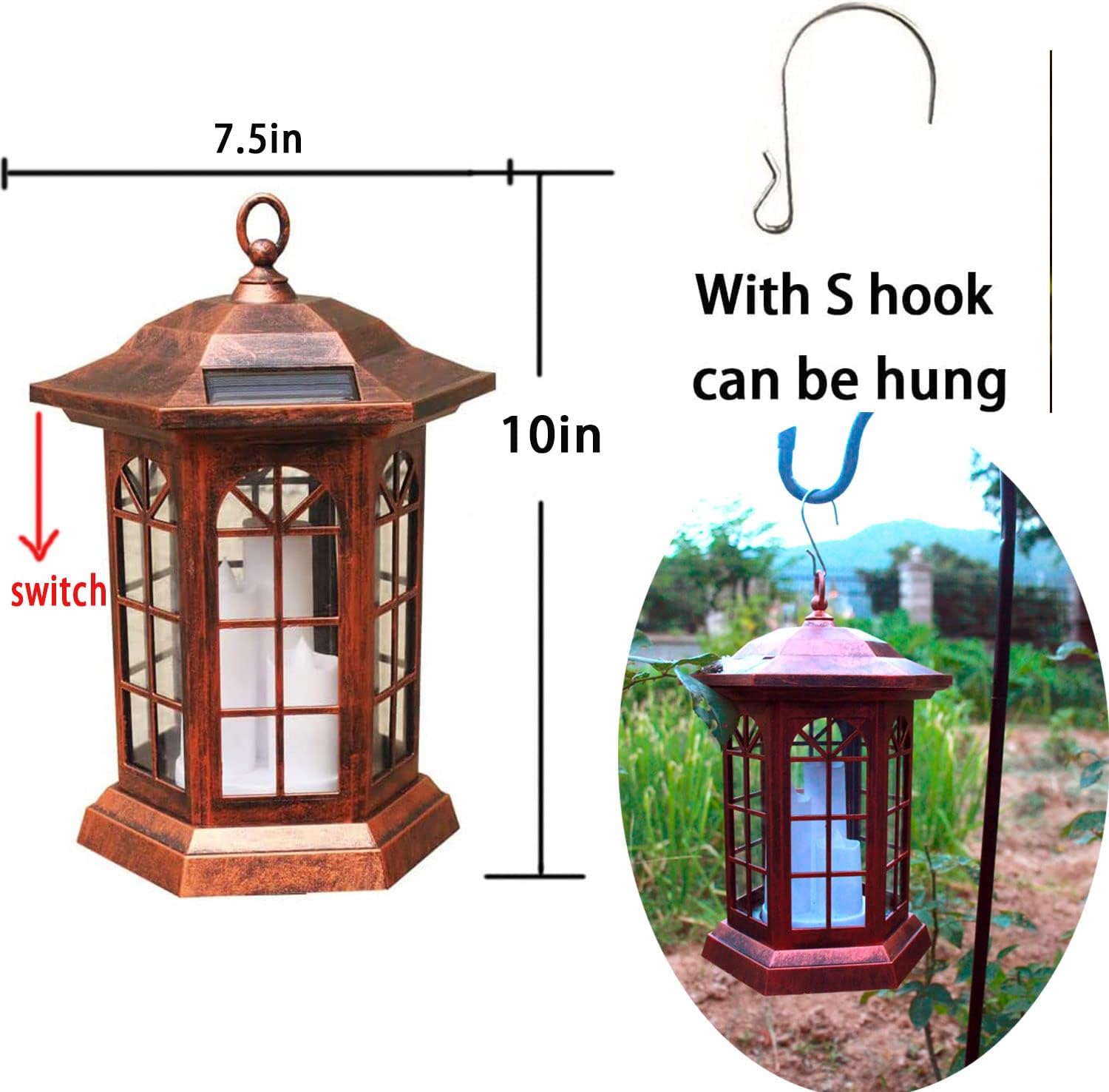 - 【easy to use】Each candle lantern is equipped with an "S" hook, so you can not only put it on the tabletop, but also hang it on a shepherds hook.this beautifully crafted solar powered lanternPerfect for garden