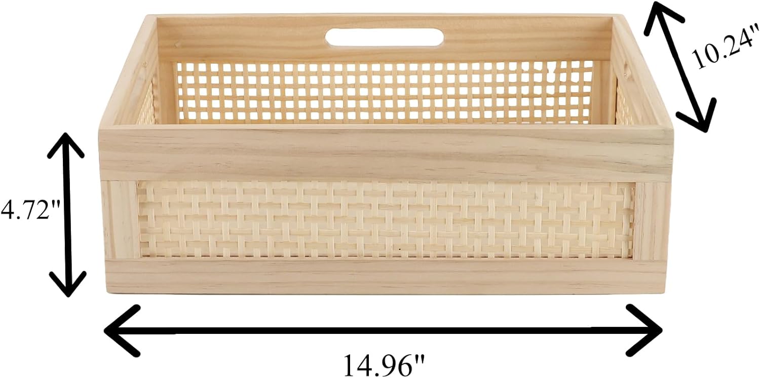 - [PREMIUM WOODEN BASKET] This wooden storage basket are made from high-quality paulownia wood with built-in handles.The angle and the surface are sanded and made firmly by craftsmen. The side face set four woven bamboo mesh, it keep basket lighter and visible from outside.
