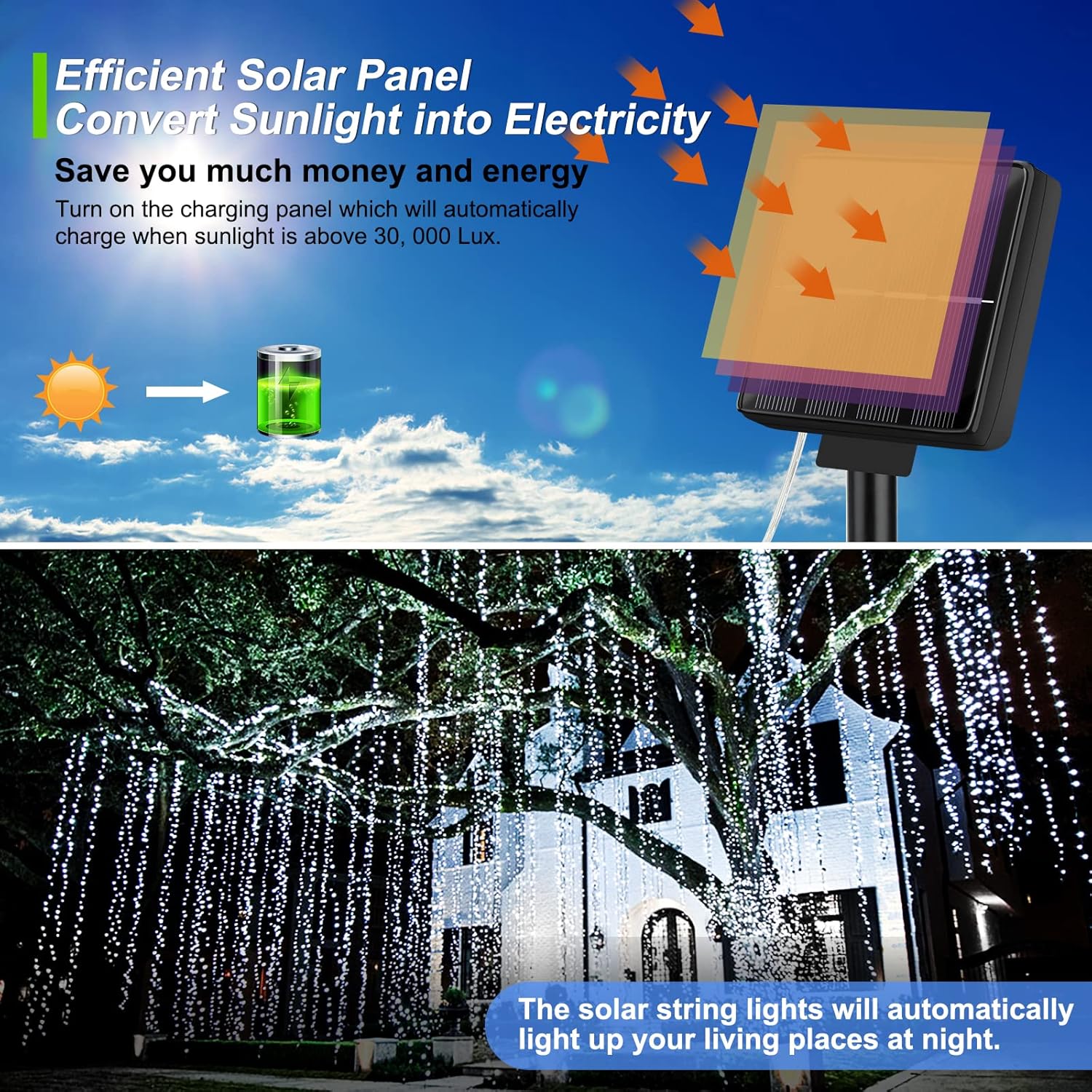 - 【Eight Romantic Lighting Modes】These solar string lights feature eight lighting modes, including steady on, combination, in waves, sequential, slow-glow, chasing, slow fade and twinkle. Different lighting settings produce different lighting atmosphere. So you could choose your preferred lighting mode to decorate your home in special festivals or brighten up the exterior of your home at night