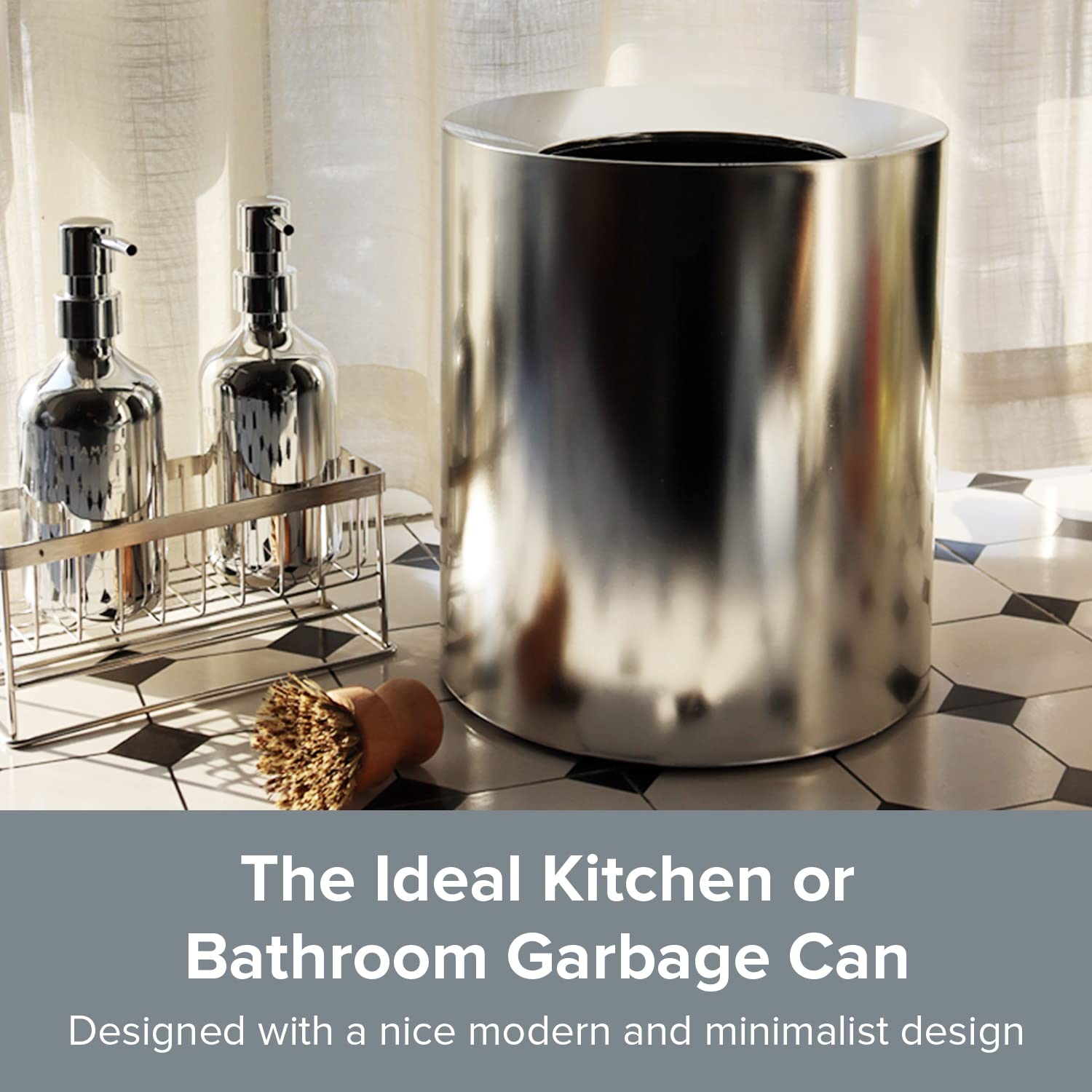 - The Ideal Kitchen or Bathroom Garbage Can - Whether you're busy making meals or you're simply doing your own thing, you can literally drop your trash then go when you have this convenient 8 or 12-liter modern garbage bin. With a thick and wide rim, truly makes for the perfect kitchen garbage can or bathroom wastebasket without fear of spilling all the nasties
