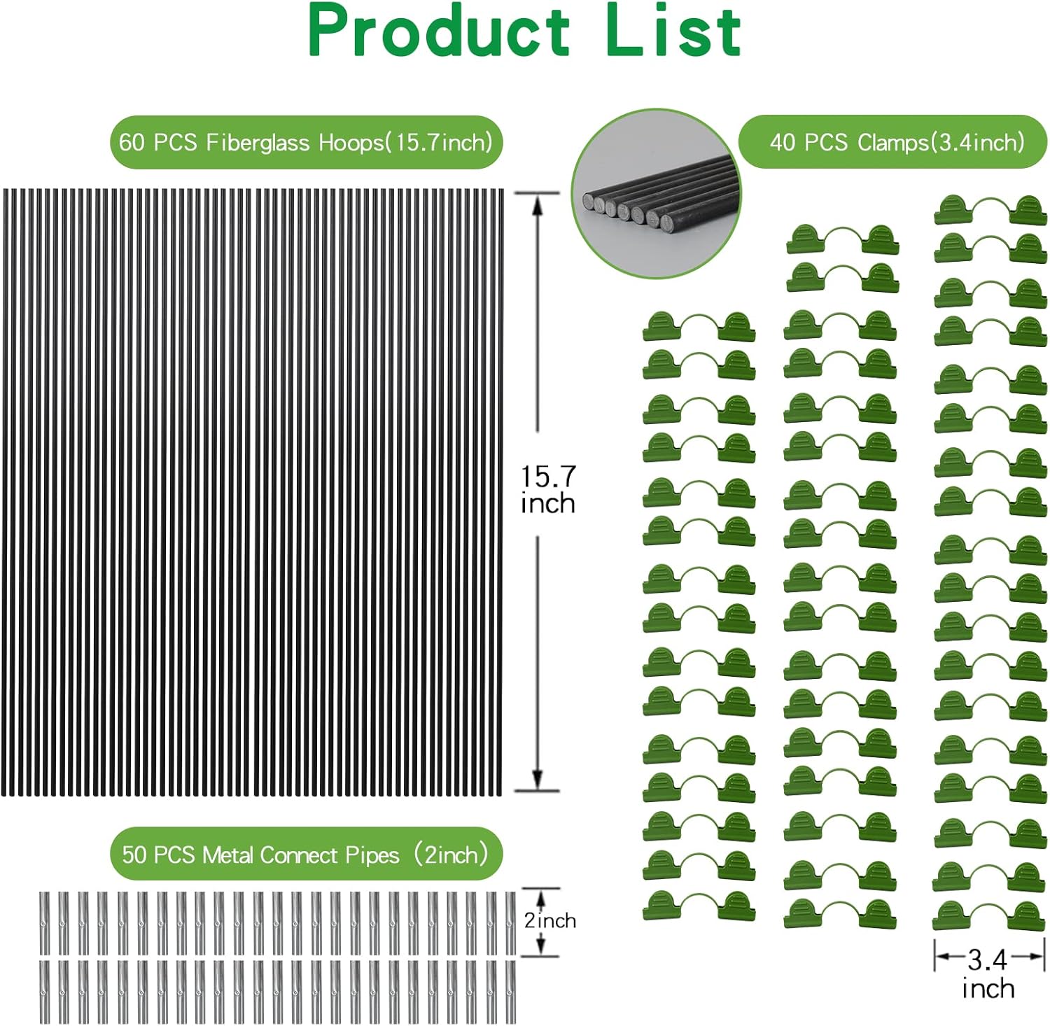 - Package: Include 60 pcs 16 Inch rust-proof fiberglass greenhouse hoops, 50 pcs 2 inch metal connect pipes and 40 pcs 3.4 inch clamps. DIY your own grow tunnel!