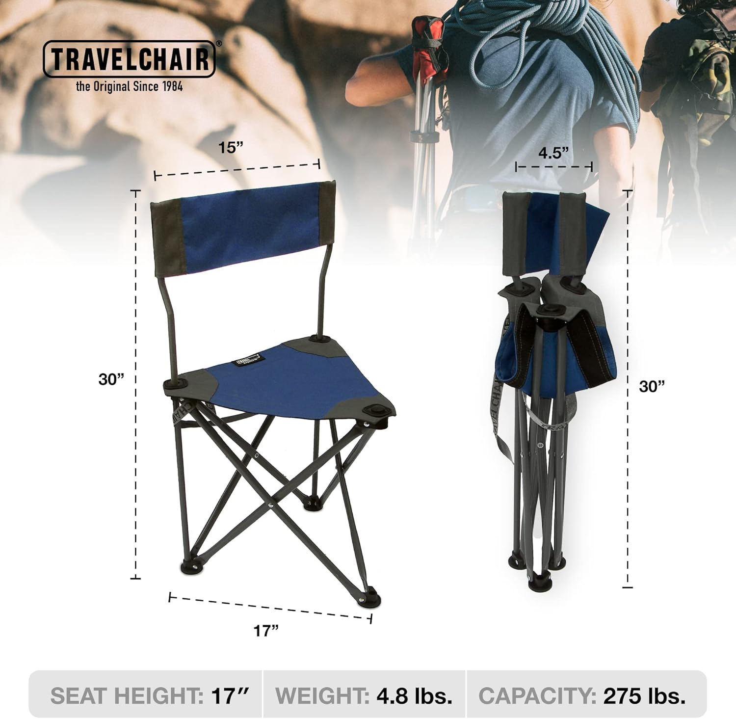 Travel Chair Ultimate Slacker, Quick Folding Tripod Stool with Backrest, Fishing Camping Hiking Chair with Carry Strap, Polyester, Blue