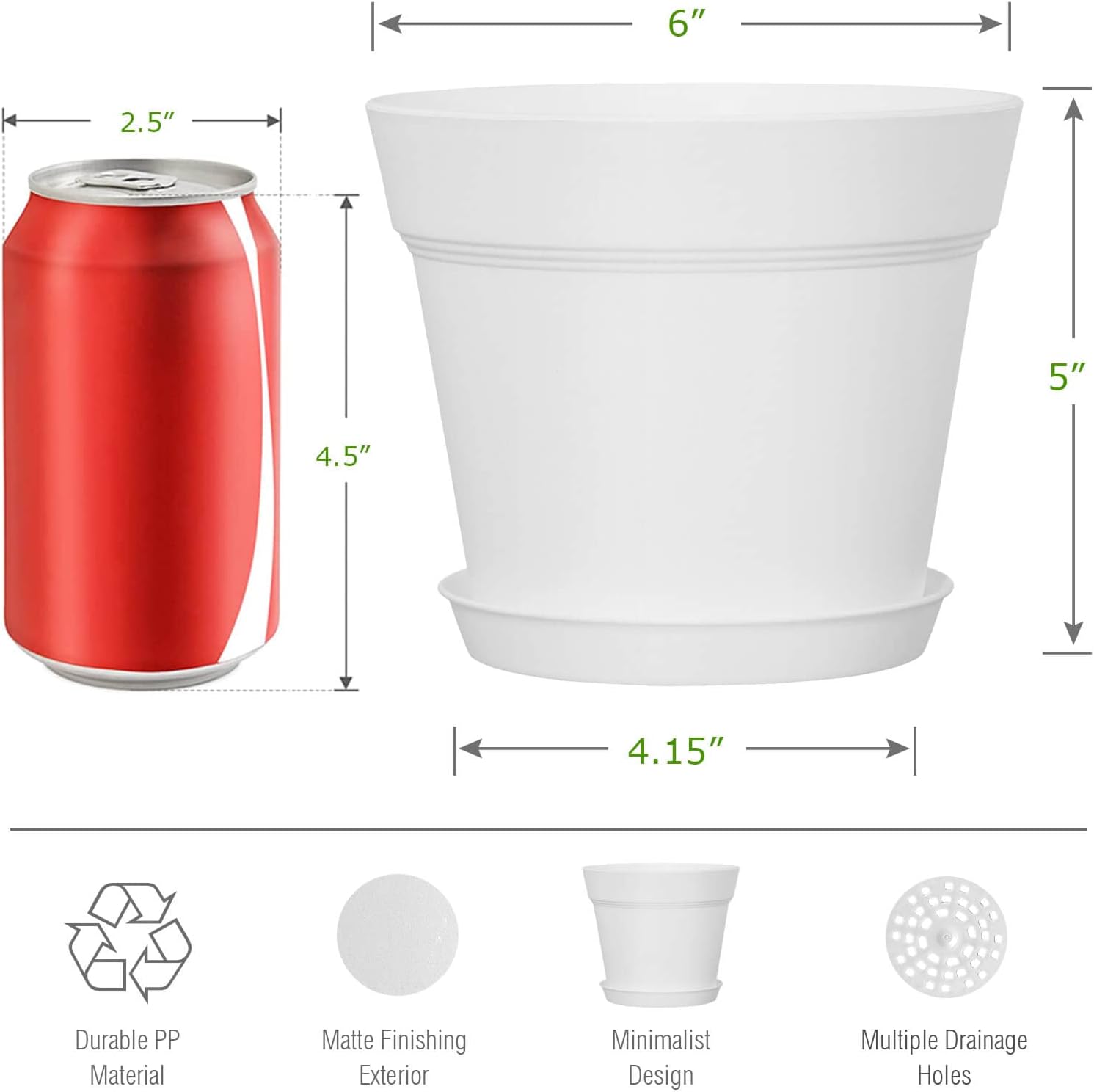 WOUSIWER 16 Pack 6 inch Plastic Planters for Indoor Flower Pots, Heavy Duty and Stylish 6 Inch Plant Pots for Indoor Plants with Drainage Holes and Tray for Plants, Flowers, White
