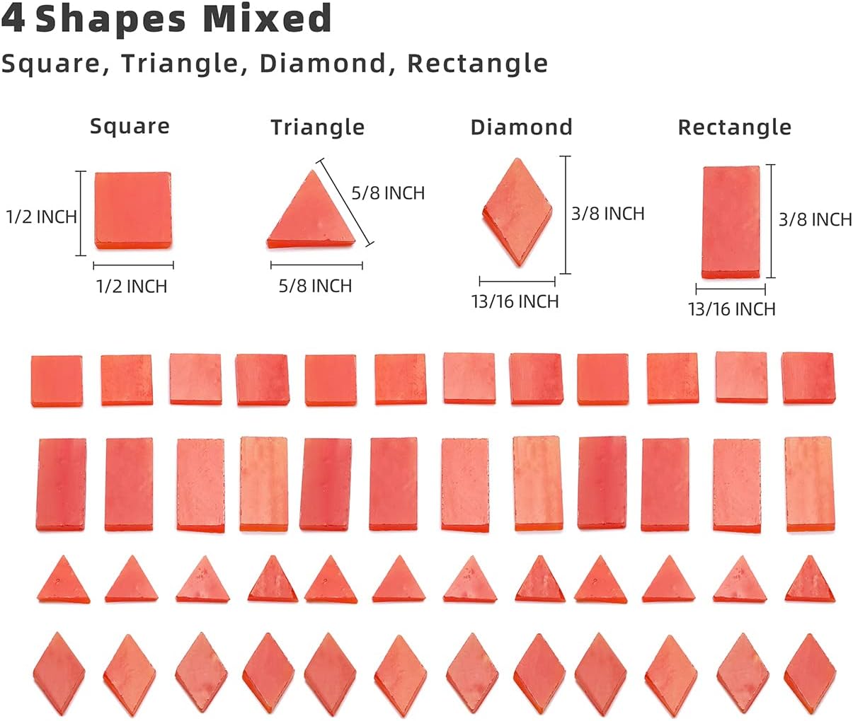 - 4 shapes mixed in each package - These mosaic pieces come with Square, Rectangle, Diamond and Triangle. Having all these precut beautiful shapes will not only save you a tremendous amount of time, but will also inspire you when trying to create new designs
