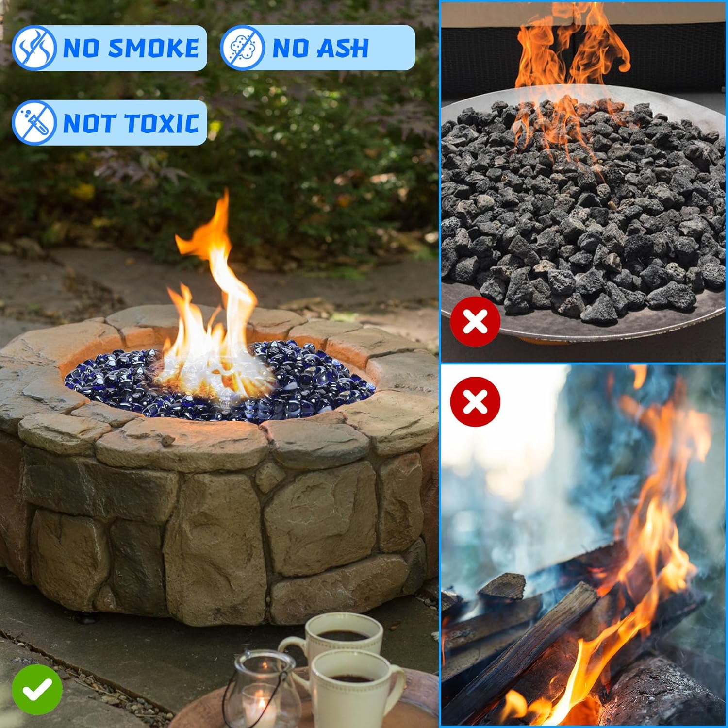 Fire Glass for Propane Fire Pit, Fireplace and Outdoor Decoration, Cobalt Blue Firepit Rocks 20 Pounds, High Luster 1 Inch Diamond Glass Beads