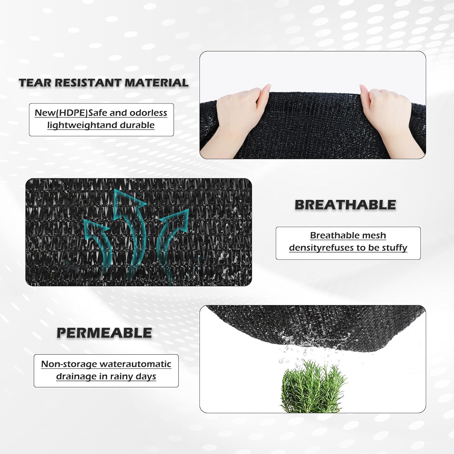 - Rust-Resistant Metal Grommets: The shade cloth features sturdy metal grommets that are resistant to rust, ensuring easy installation and hassle-free hanging in any setting