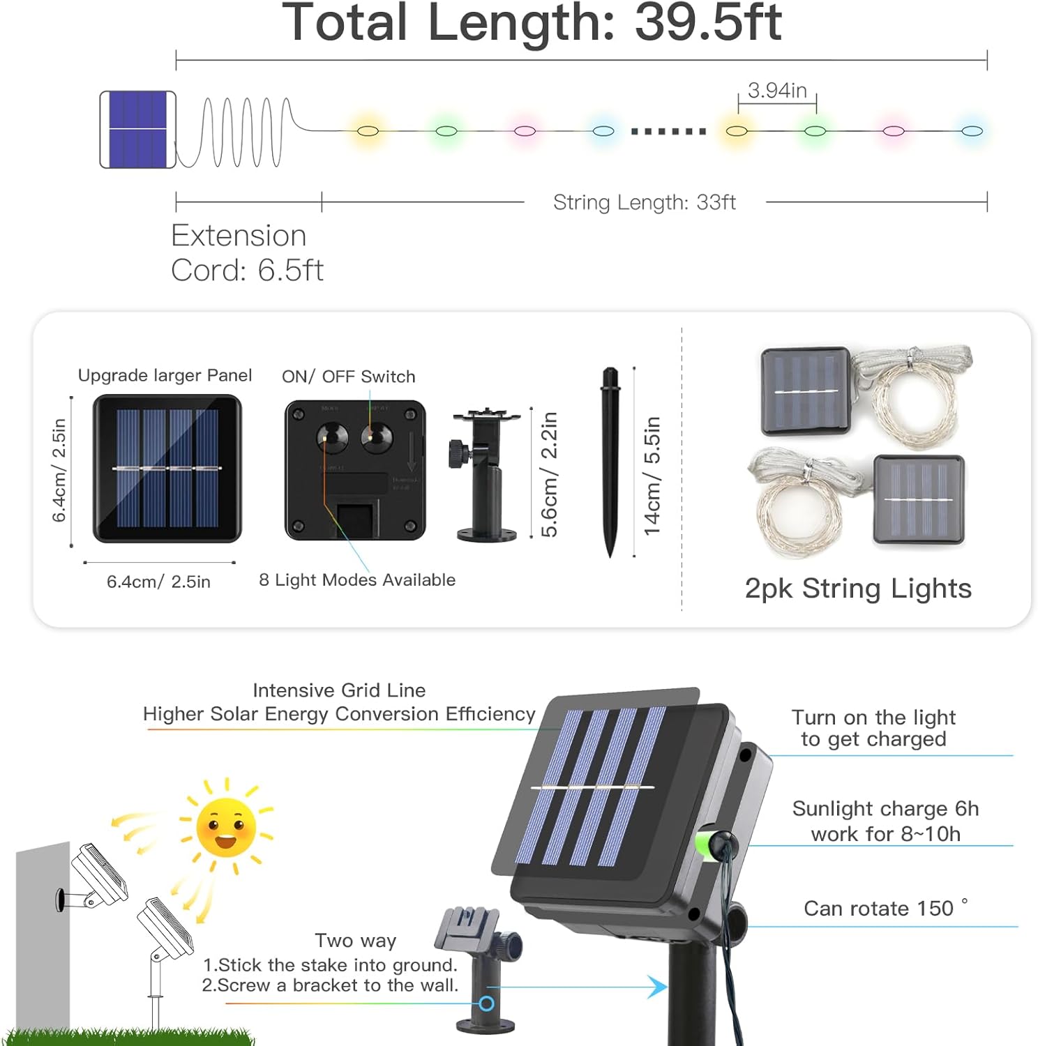 - 2 PACK & SIZE: SUDDUS solar camping string lights come with 2 packs of string lights. Each string is 33 feet long with 100 led bulbs 3.94 inches spaced apart. Two strings' total length is 66 feet. The extension cord is 6.6-feet between the panel and the first bulb.