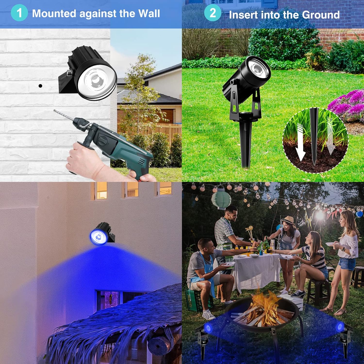- Two ways to install: stake-to-ground OR wall-mount. With two screws, you can fix the solar panel on the wall OR just drive the stake into the ground. No wiring is needed. Very easy to install. We also offer two stakes for the lights, you can use them to hold the lights Or just put the lights on the ground.
