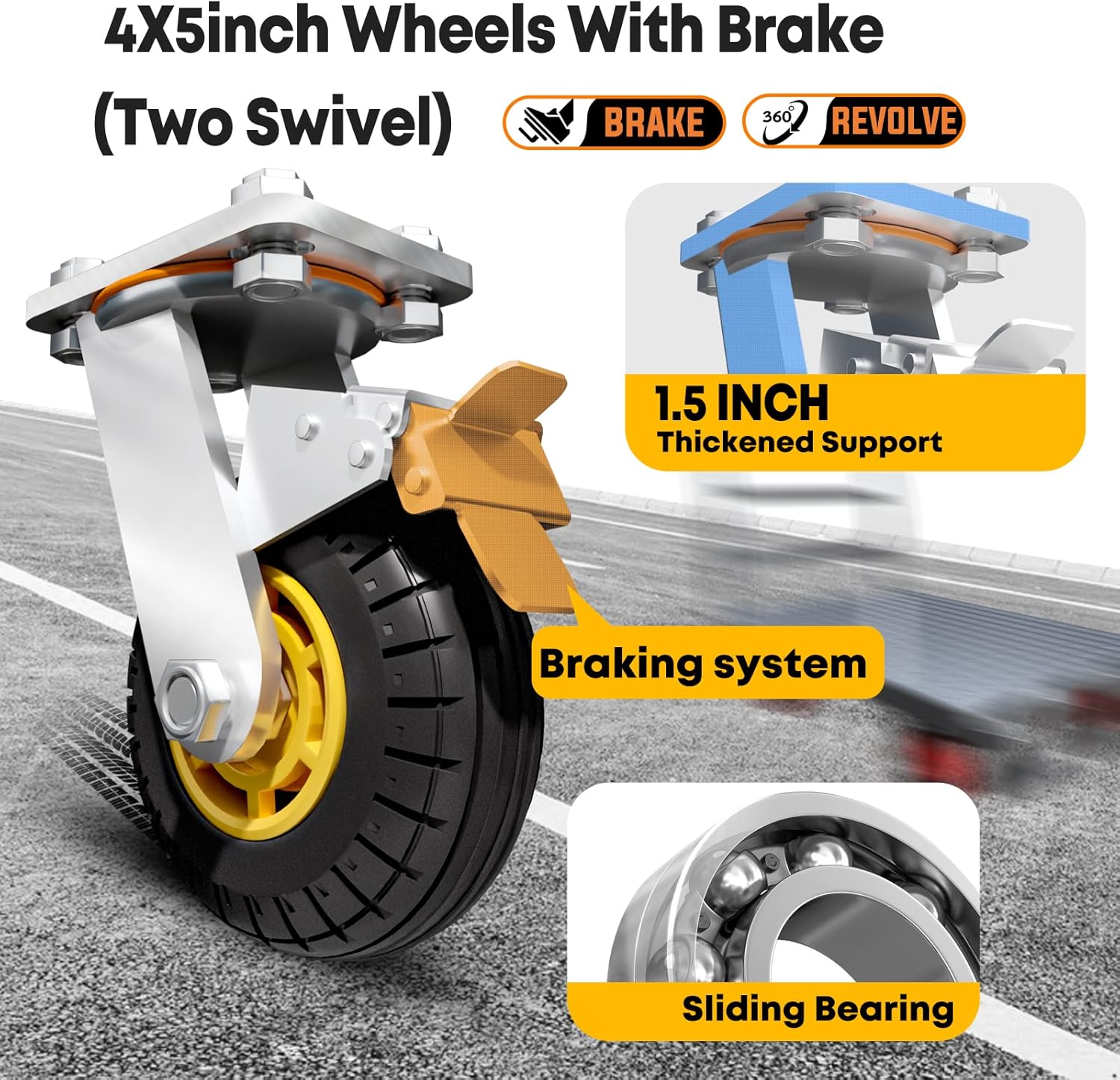 - [Easy Control with BRAKE DESIGN]: 4 wheel flat carts have 2 rigid caster wheels and 2 swivel wheels with BRAKE DESIGN so that you can easily move the extra long push cart dolly in any direction you need and stop in anywhere; 5 inch diameter caster wheels made of solid rubber ensure maneuverability on pavement or gravel.