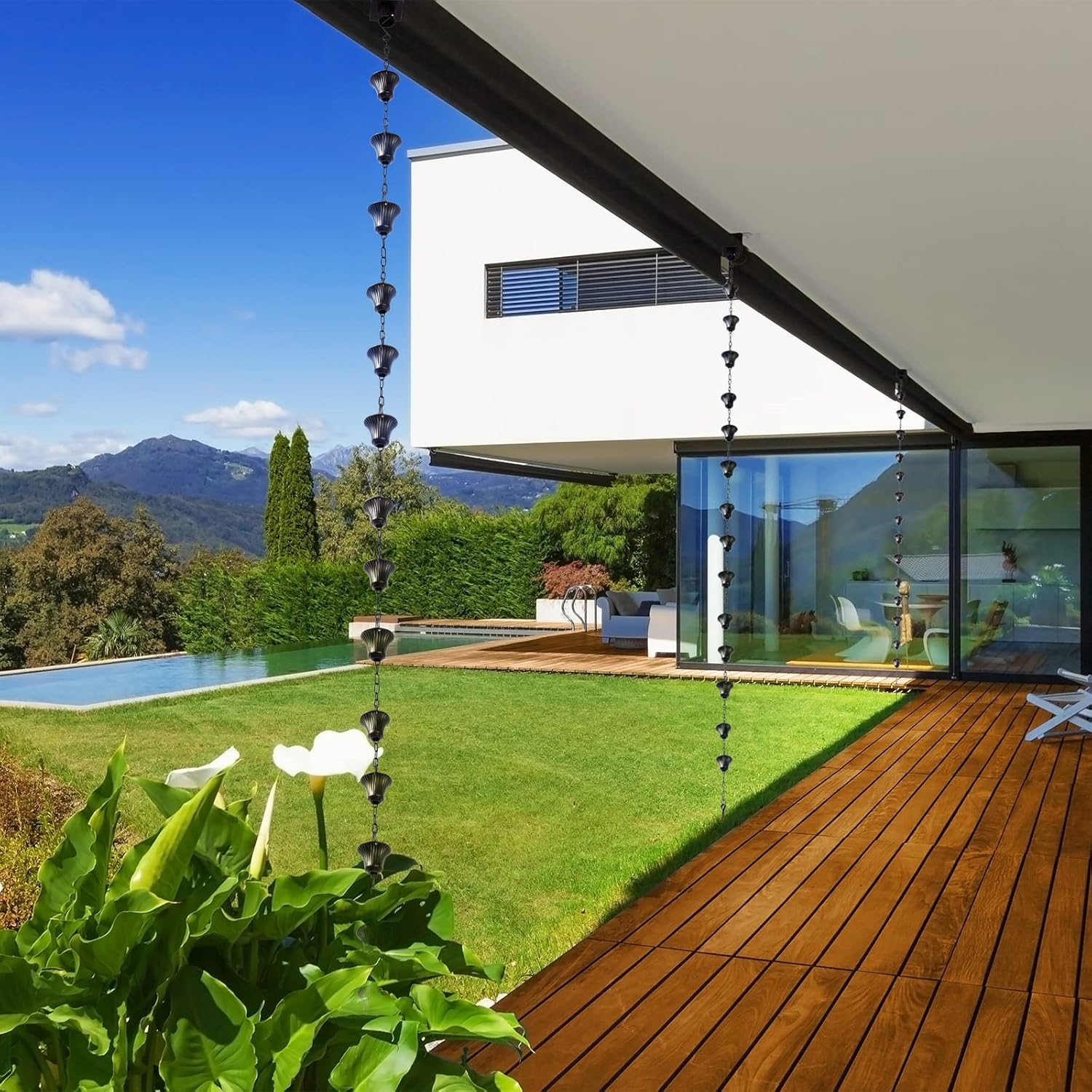 - Classic Look Design: The standard length of the drain rain chains for gutters is 8.5 ft long and consists of 14 cups, with individual flared-shaped cups measuring 3.56 inches wide by 2.69 inches high in diameter, which visibly direct rainwater along the rain chains to collect in a bucket, barrel or watering can.