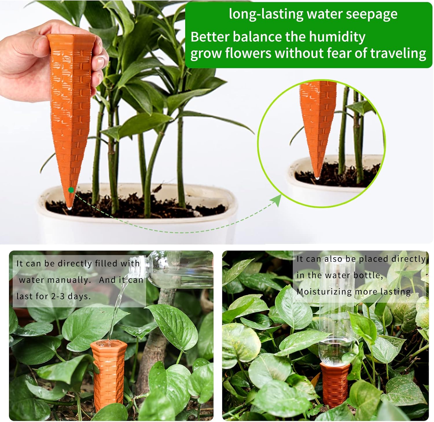 - 【Ideal for Travelers】These plant watering spikes for potted plants will give you peace of mind while on vacation. A litre of water works for approximately 7-10 days depending on the types of plants drawing water, soil composition, humidity. For large pot,you can put one plant watering spike by each plant or use a large wine bottle. Tips: Please test the release speed of the plants waterer before traveling to protect the life of the plants.