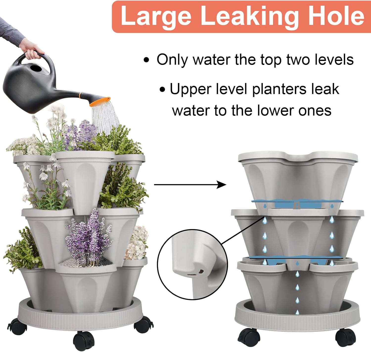 DUNCHATY Stackable Planter, Vertical Garden Planter with Wheels and Tools, Self Watering Strawberry Planter Indoor/Outdoor 3 Tier Herb Planter Pots for Growing Vegetables and Succulents,Gray