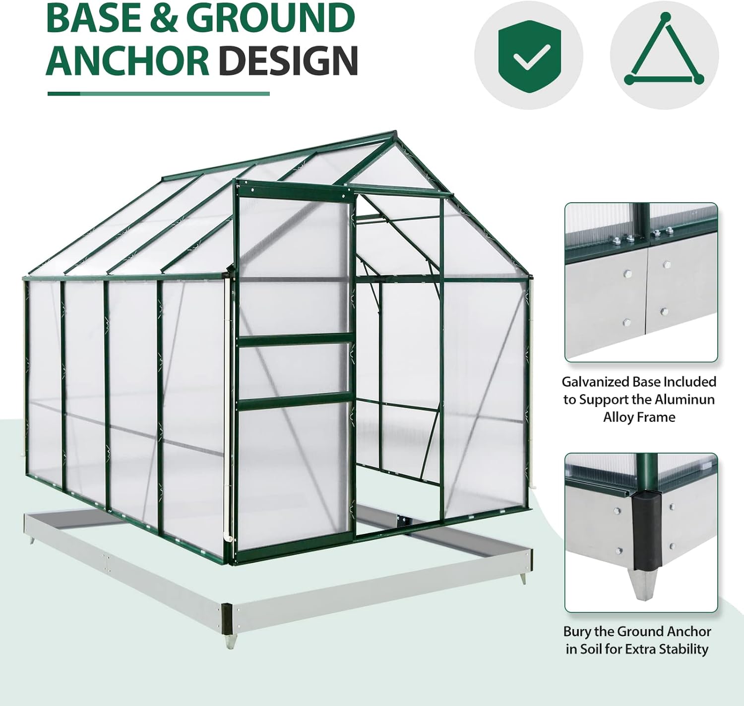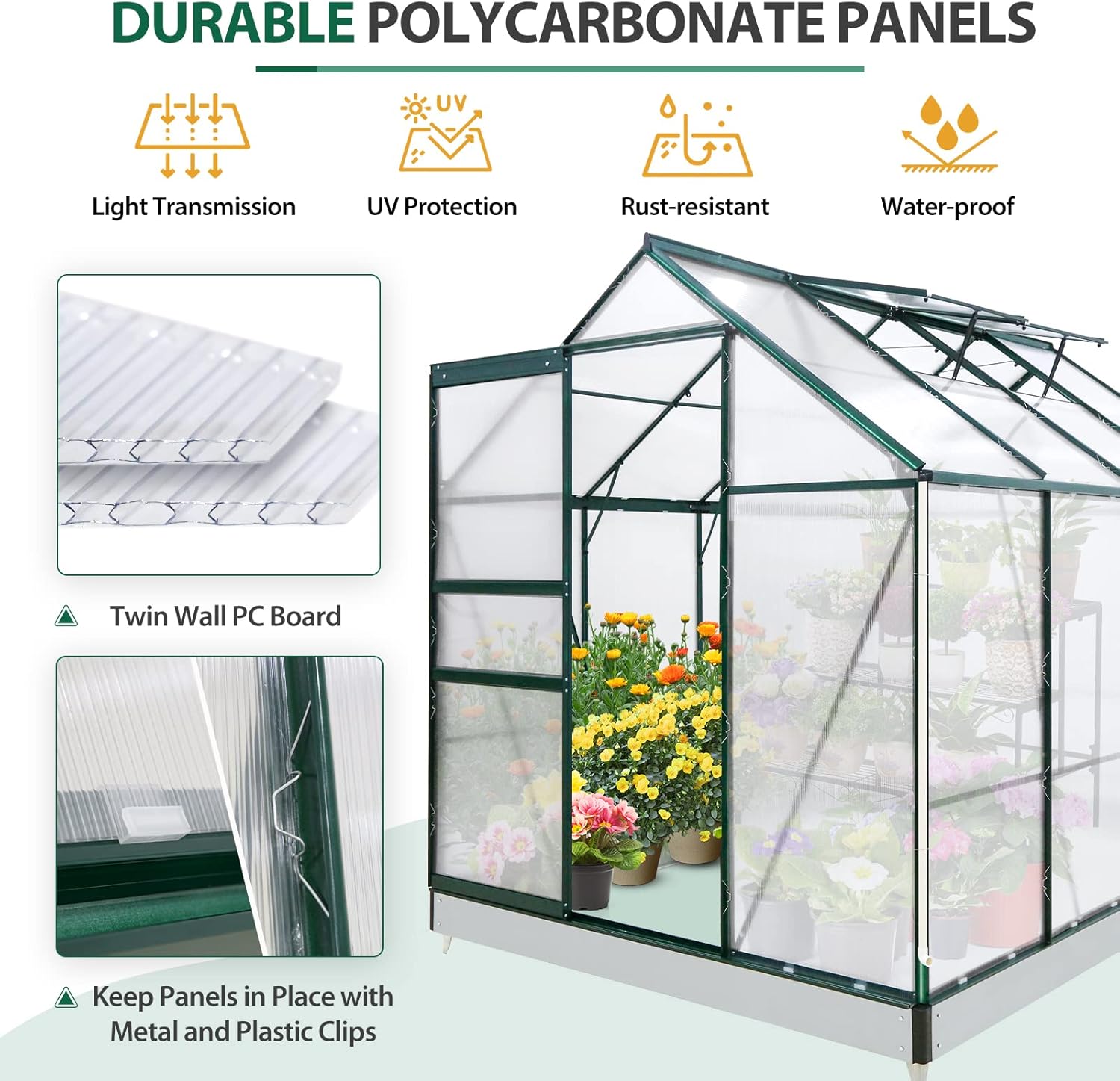 EAGLE PEAK 6x8x7 Outdoor Walk-in Hobby Greenhouse with Adjustable Roof Vent and Rain Gutter, Base and Anchor, Polycarbonate Aluminum Green House for Backyard Garden, Dark Green