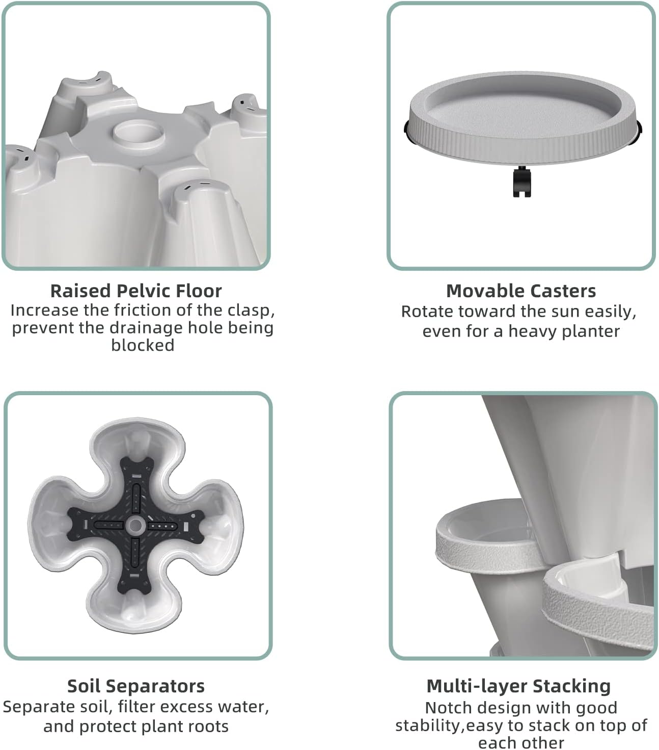 - Flow Design - The water filtration system from top to bottom can save water and retain moisture but prevents overwatering or root rot. 3 filters are placed on each level to keep the soil from going through the big drainage holes, it also helps retain water in each planter level.