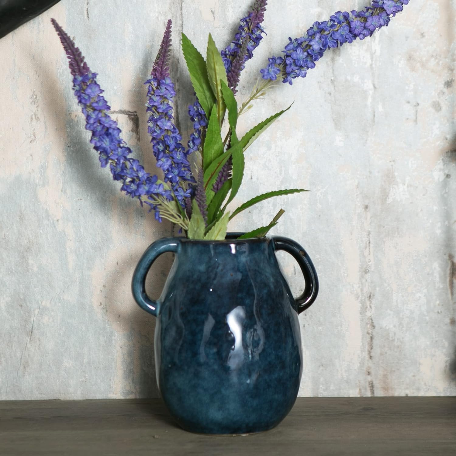 Blue Ceramic Vase with 2 Handles, Modern Farmhouse Decor, Rustic Terracotta Pottery, Decorative Flower Vases, Clay Small Vase, Centerpiece for Dining Table - 7 Inch Tall