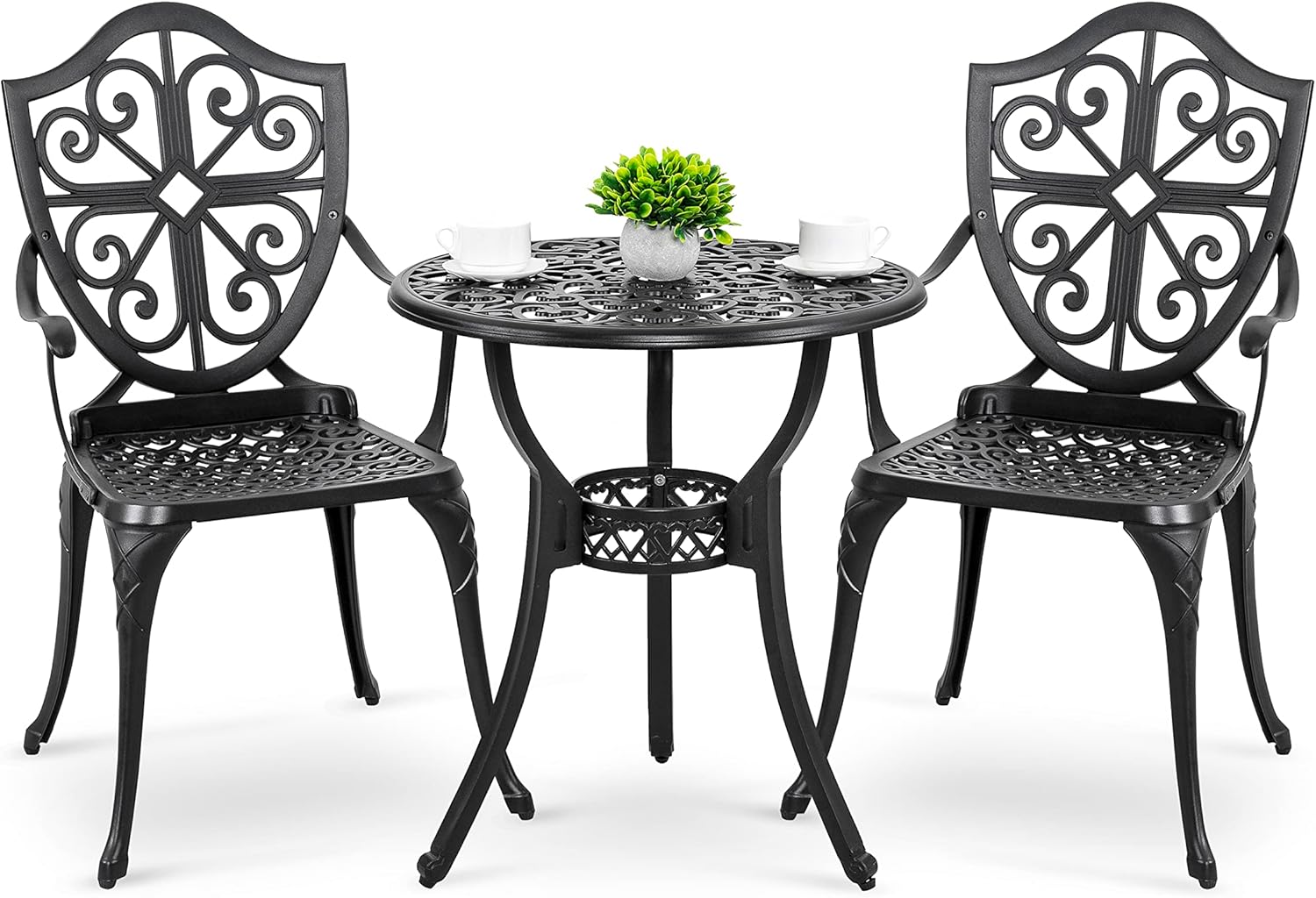 - Ergonomic Design: Ergonomic back and concave seat provide excellent support for your lumbar and back to lie down, and curved armrests give arms space to rest on. Its simple and modern black design of outdoor bistro table and chairs set for 2 goes well with any outdoor environments