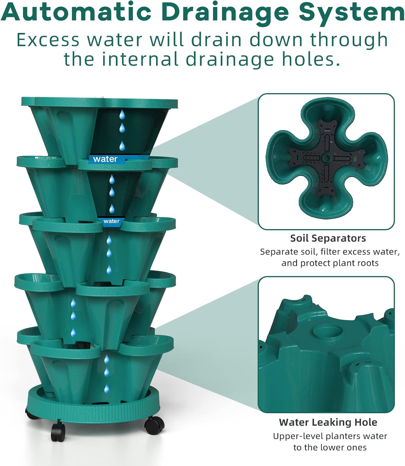 - Flow Design - The water filtration system from top to bottom can save water and retain moisture but prevents overwatering or root rot. 3 filters are placed on each level to keep the soil from going through the big drainage holes, it also helps retain water in each planter level.