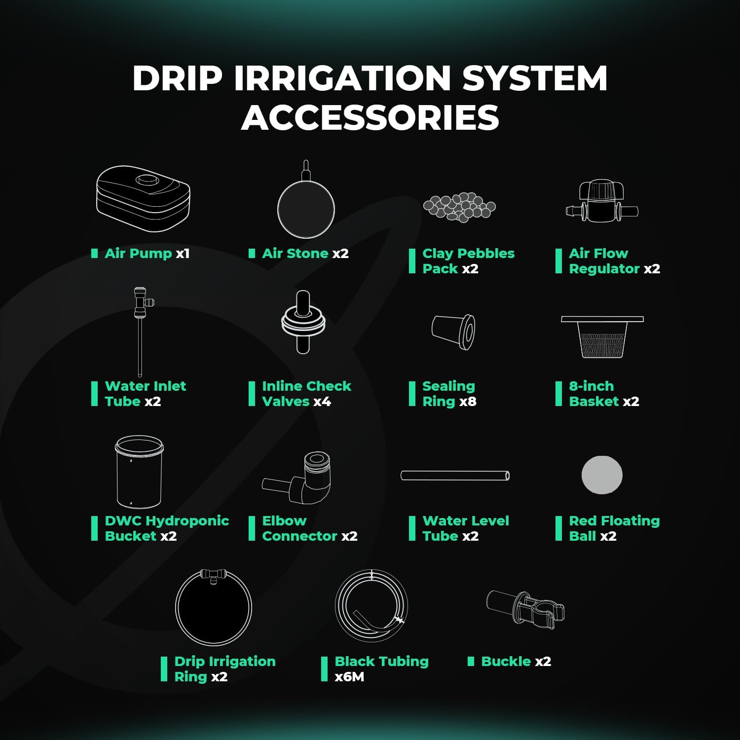 - 【DWC HYDROPONICS SYSTEM INCLUDE】2Pcs 5-Gallon Buckets, 8W Air Pump, 2Pcs Air Stone, 2Pcs Top Drip Kit, 6M Air Tubes, 2Pcs Visual Water Level Indicators, 4Pcs Check Valve, 2Pcs Air Flow Regulator, 2Pcs Clay Pebbles.