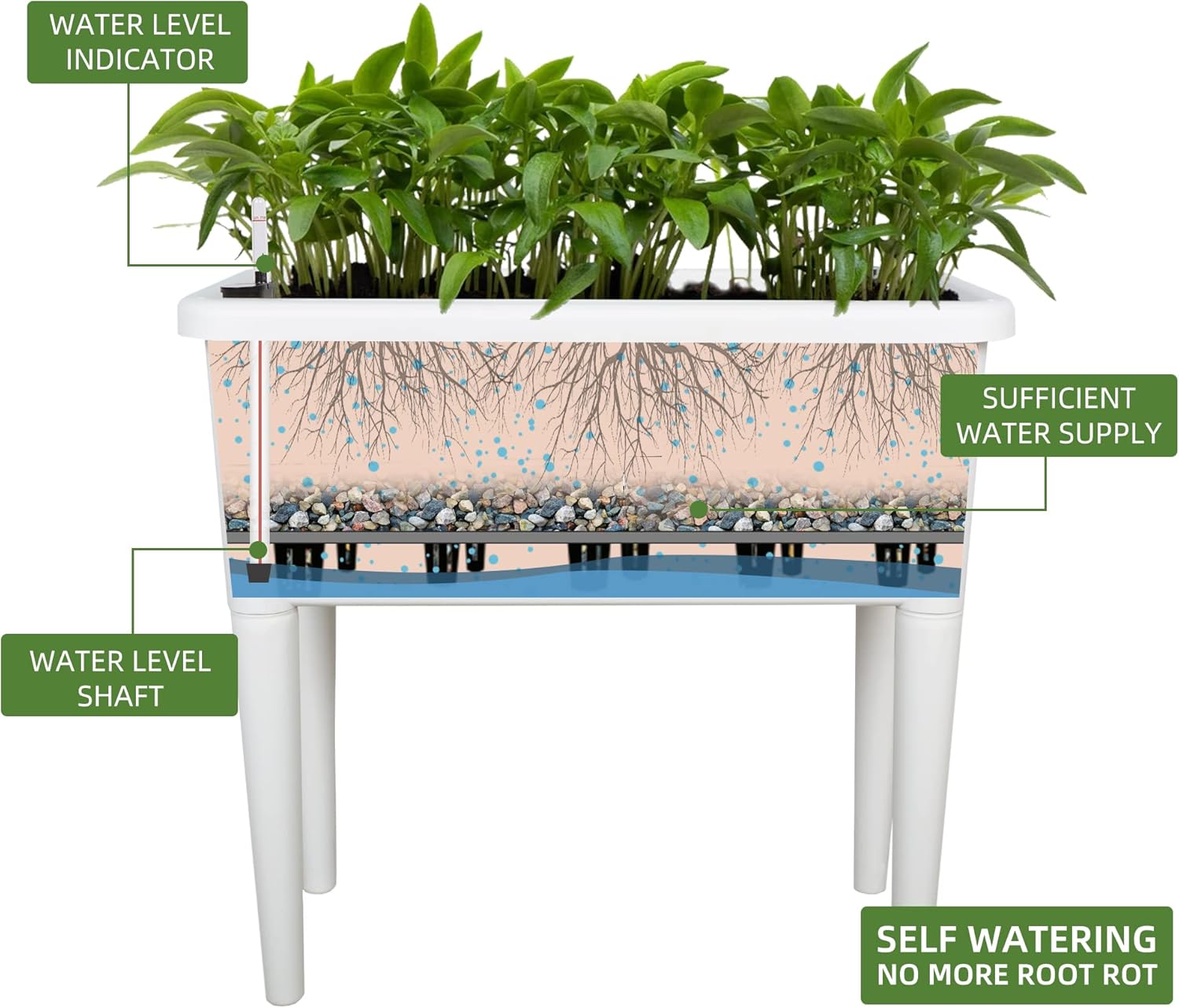 - SELF WATERING & NO MORE ROOT ROT - The smart unique sub-irrigation system is one of the most appealing aspects among all Dexceder planters. The easy-to-use separated integrated water reservoir or catcher keeps your soil well aerated and automatic supplies plants with the right amount of ongoing moist air & nutrition for optimal growth. The full water supply period can single-handedly last over 3 weeks based on different live plants