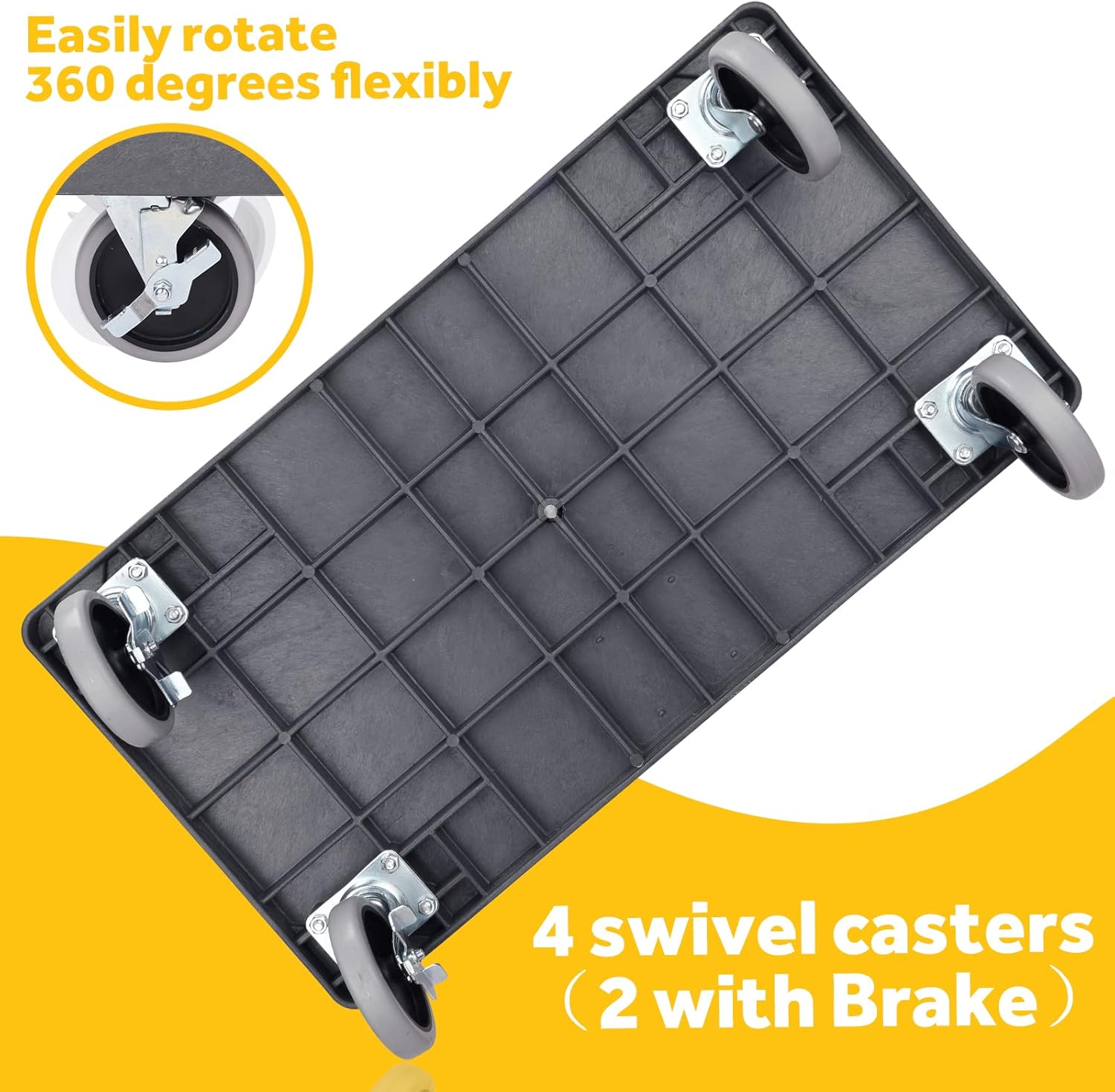 - 🔆 EASY MANEUVER & LOCKING BRAKES: Equipped with four swivel casters, two of which are lockable, this cart ensures effortless navigation even in confined spaces. The 5-inch wheels are crafted from industrial-strength polypropylene for smoothness and durability. Moreover, an exterior wrap of Thermo-Plastic-Rubber not only absorbs shock and reduces noise but also prevents floor scratches and carpet snags. Experience 360-degree flexibility and labor-saving transport.
