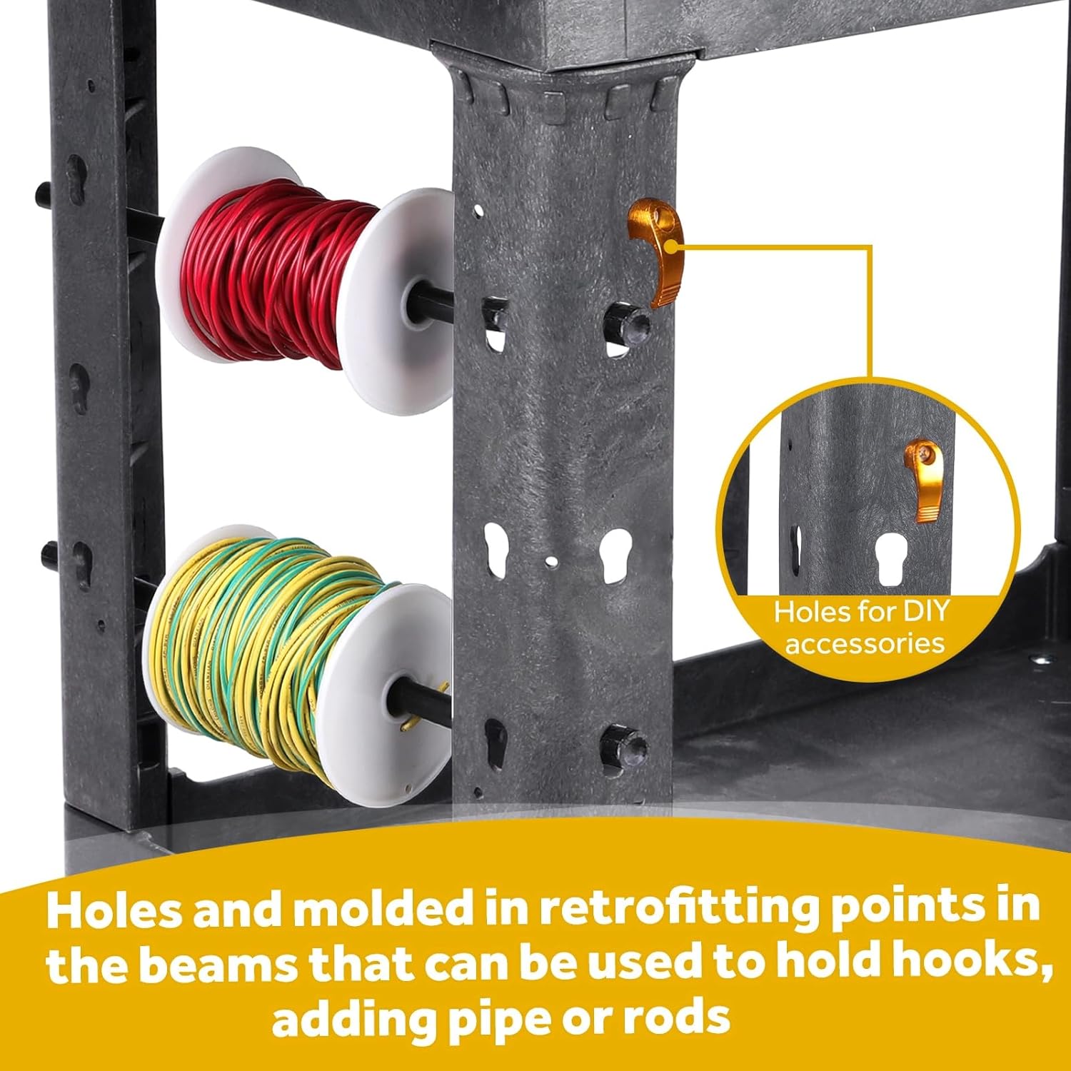 - 🔆 ERGONOMIC HANDLE AND CUSTOMIZABLE FITTINGS: Our service cart ergonomic push handle is molded into top shelf with a built-in storage compartment, which provides optimum hand placement and pushing height to improve control & worker safety. Molded In Retrofitting Points in beams allow you to add pipe or rods to hold wire spools and other roll type goods.
